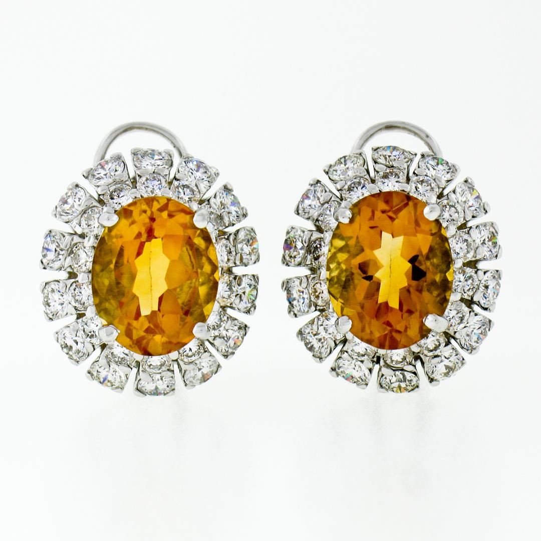 A solid 18k white gold omega earrings, with 2 oval cut natural citrines (10x8mm - 5.00ctw ), surrounded with double halo of 56 round brilliant cut natural diamonds ( F/G - VVS2/VS1 ; 2.80ctw). The earrings measure approximately 15.8x14.2mm and weigh a total of 8.02 grams.