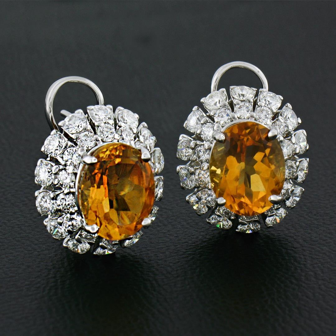 A solid 18k white gold omega earrings, with 2 oval cut natural citrines (10x8mm - 5.00ctw ), surrounded with double halo of 56 round brilliant cut natural diamonds ( F/G - VVS2/VS1 ; 2.80ctw). The earrings measure approximately 15.8x14.2mm and weigh a total of 8.02 grams.