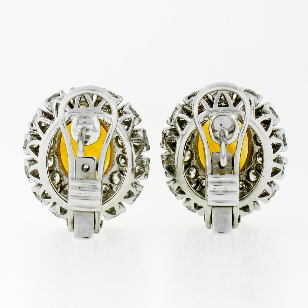 A solid 18k white gold omega earrings, with 2 oval cut natural citrines (10x8mm - 5.00ctw ), surrounded with double halo of 56 round brilliant cut natural diamonds ( F/G - VVS2/VS1 ; 2.80ctw). The earrings measure approximately 15.8x14.2mm and weigh a total of 8.02 grams.