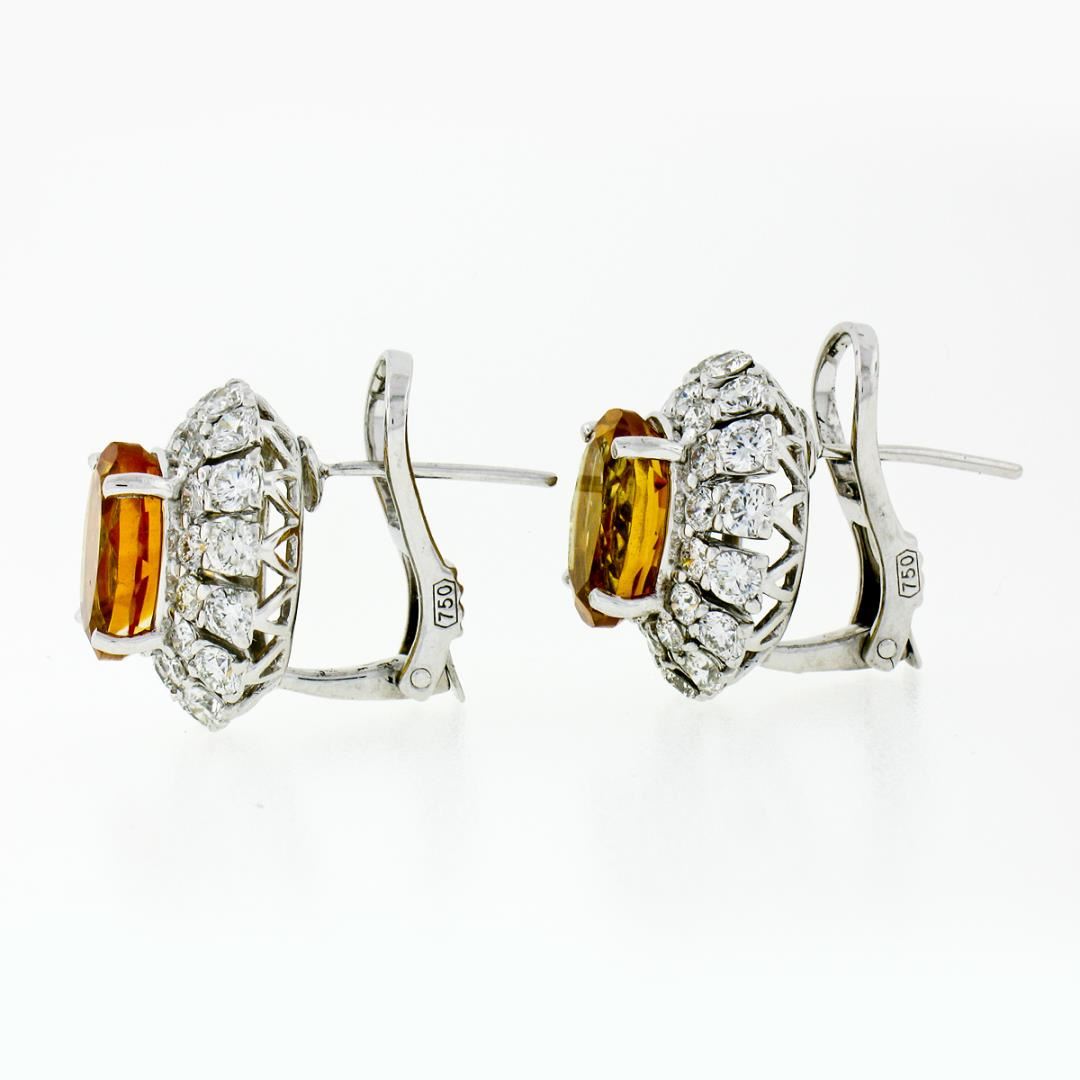 A solid 18k white gold omega earrings, with 2 oval cut natural citrines (10x8mm - 5.00ctw ), surrounded with double halo of 56 round brilliant cut natural diamonds ( F/G - VVS2/VS1 ; 2.80ctw). The earrings measure approximately 15.8x14.2mm and weigh a total of 8.02 grams.