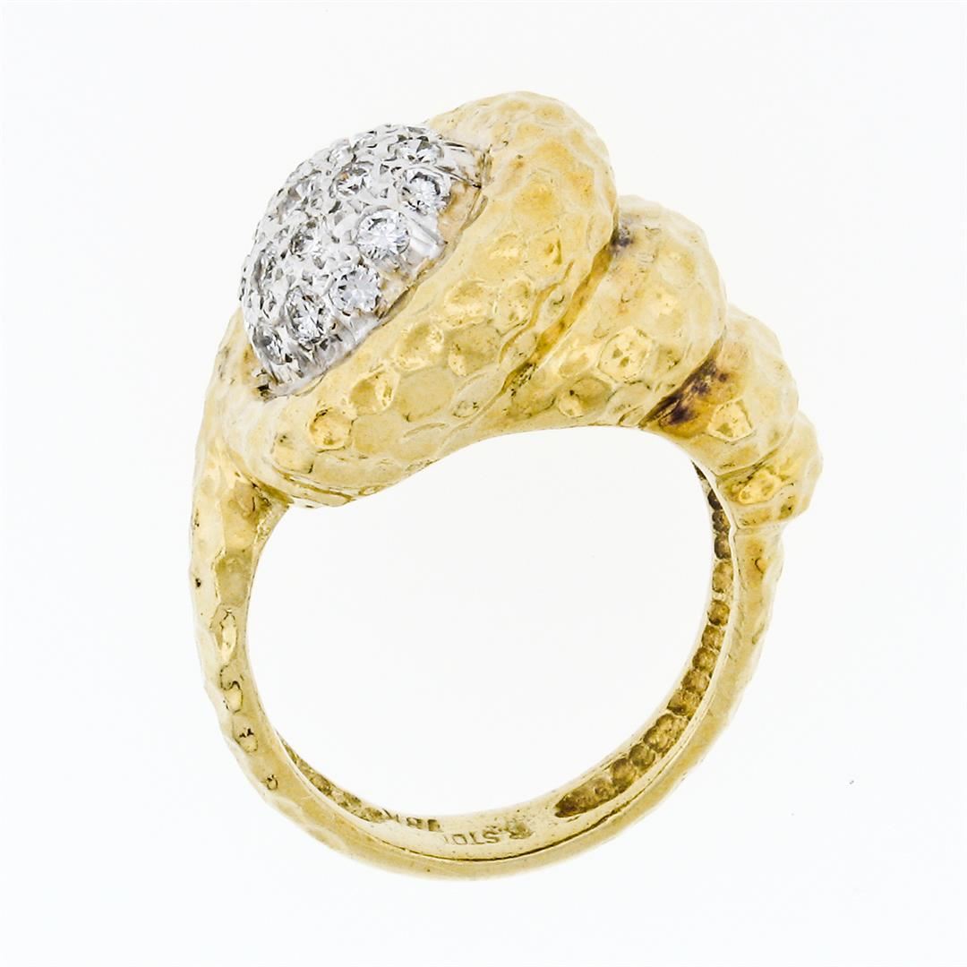 An estate solid 18k yellow & white gold cocktail ring by R. Stone, with 19 round brilliant cut natural diamonds (E/F - VS1/VS2 ; 0.45ctw). The ring is size 6.5, weighs a total of 12.80 grams, and measures 17mm wide.