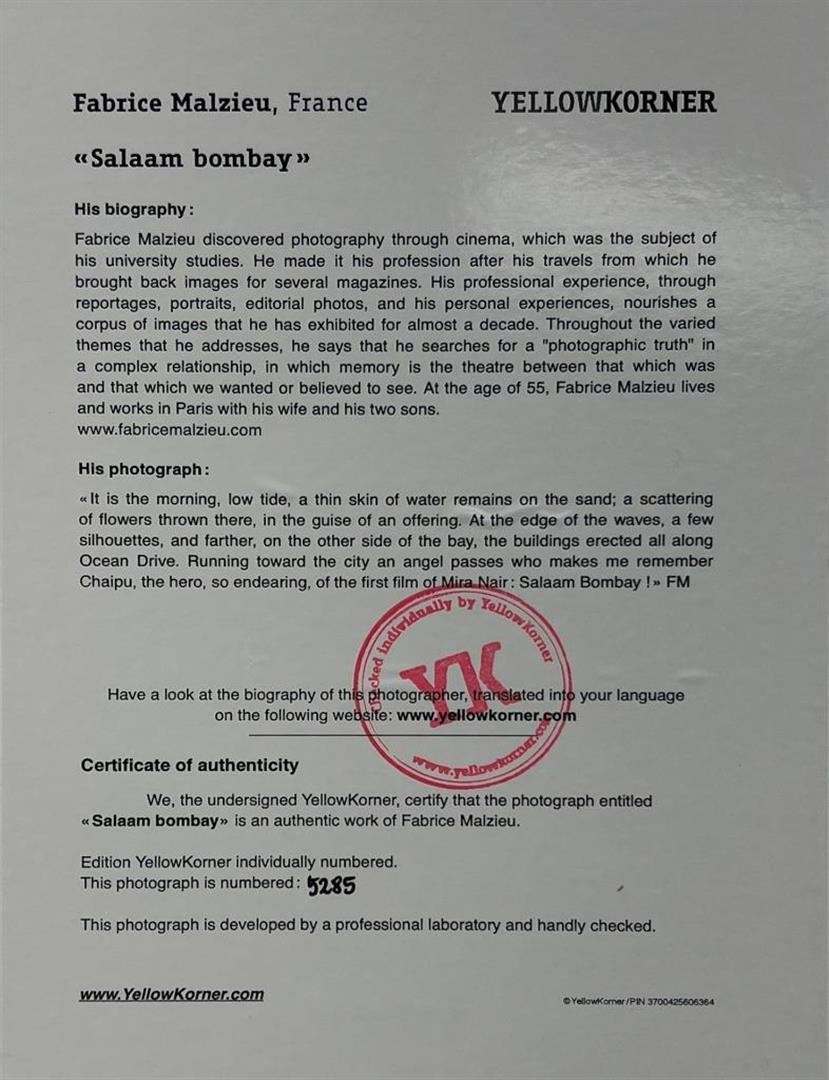 Fabrice Malzieu France Salaam Bombay YellowKorner Certified Photograph. Certificate of Authenticity from YellowKorner affixed to the back. Matted Dimensions 16"x20". Protected with Clear Mylar Sleeve.