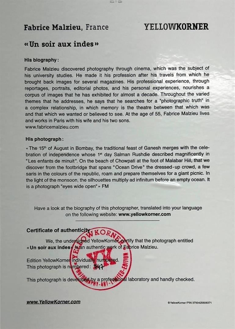Fabrice Malzieu France Un Soir Aux Indes YellowKorner Certified Photograph. Certificate of Authenticity from YellowKorner affixed to the back. Matted Dimensions 16"x20". Protected with Clear Mylar Sleeve.