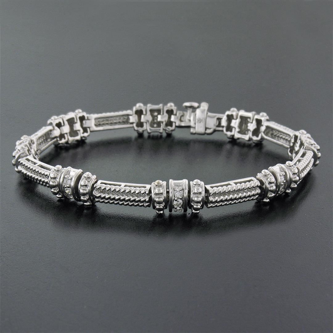 An estate solid 14k white gold twisted wire link bracelet, with 24 round brilliant cur natural diamonds (F/G - VVS2/VS1; 0.72ctw). It weighs a total of 21.86 grams, measures 7.55mm wide, and measures 7 inches in length.