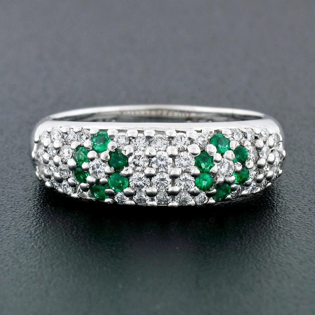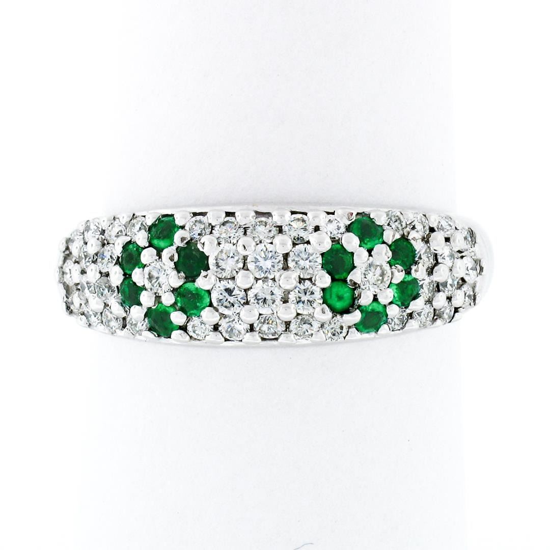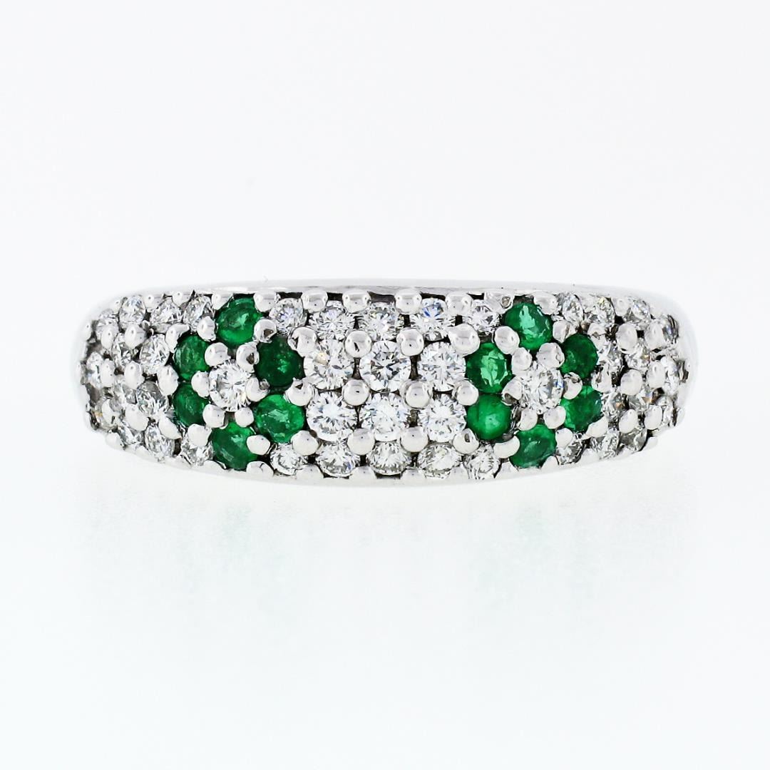 A solid 18k white gold floral band ring, with 12 round cut natural emeralds (0.18ctw), and 44 round cut natural diamonds (F/G - VS1/VS2 ; 0.50ctw). The ring is size 8.75, weighs a total of 4.6 grams, and measures 6.8mm wide.