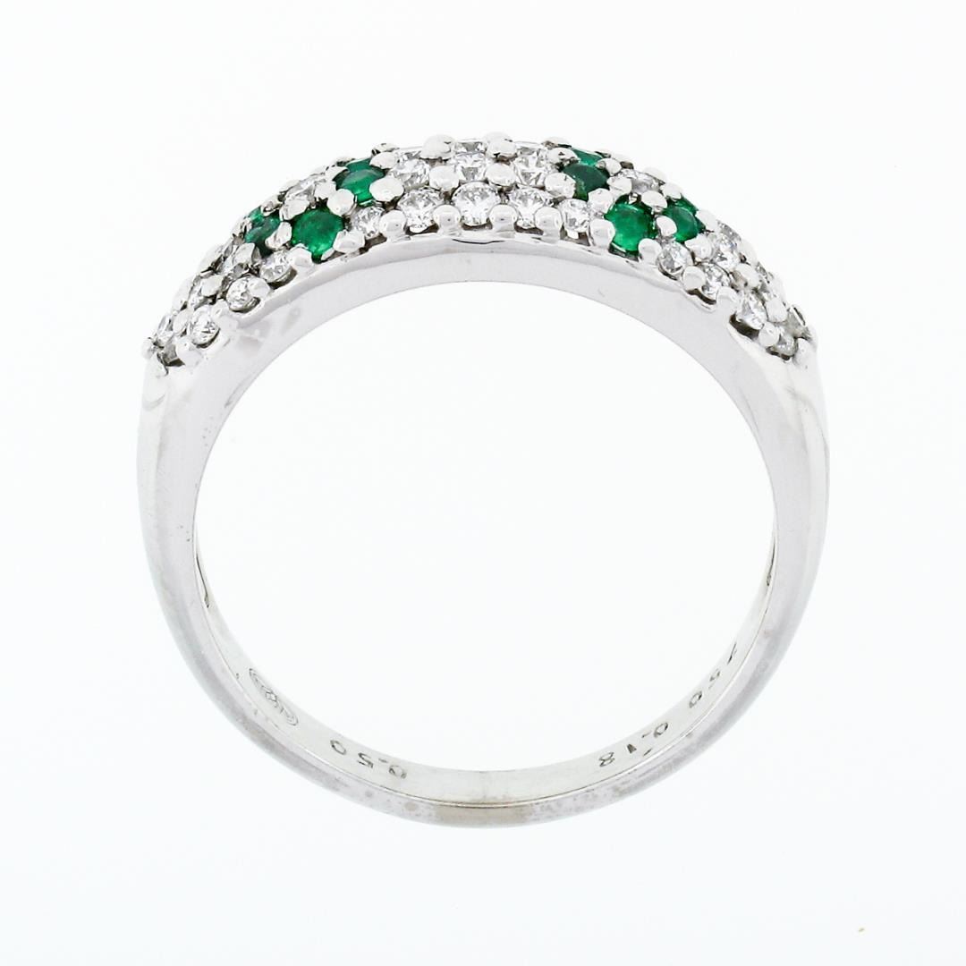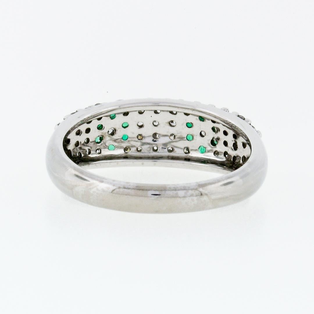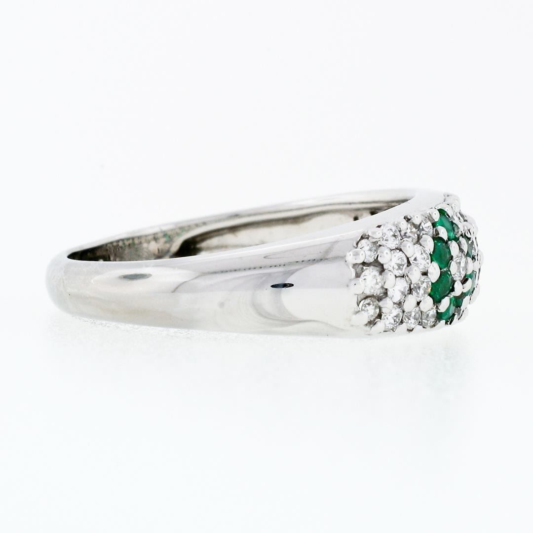 A solid 18k white gold floral band ring, with 12 round cut natural emeralds (0.18ctw), and 44 round cut natural diamonds (F/G - VS1/VS2 ; 0.50ctw). The ring is size 8.75, weighs a total of 4.6 grams, and measures 6.8mm wide.