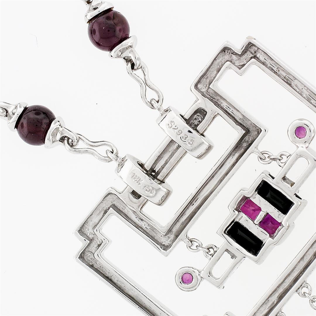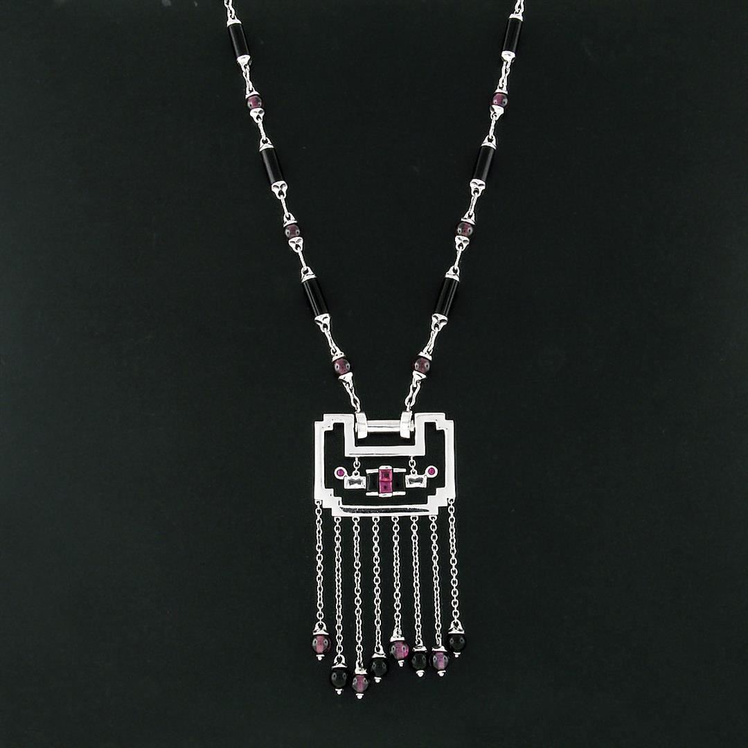 A solid 18k white gold tassel chandelier pendant necklace, with cylinder shape natural black onyx (8.8mm long x 3.8mm diameter), and 4 round bead cut natural black onyx (4.5mm), and 2 rectangular buff top cut natural black onyx (4.7x3mm), and 18 round bead cut natural rubellite tourmaline (4.5mm), and 2 square buff top cut natural ruby (2.7mm ), and 2 round brilliant cut natural ruby (), with 2 French baguette cut natural sapphires (3.9x2.7mm). 20 inch fancy link chain, 33.78 grams total weight, pendant measures 62.8x31.9mm.