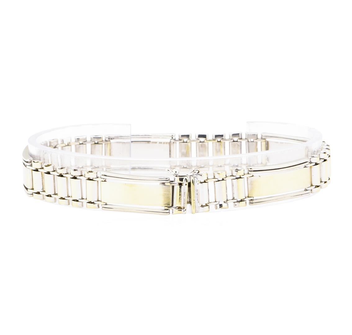 One men's fancy link bracelet measuring approximately eight inches in length and 10.5mm in width featuring: 14KT yellow and white gold weighing 23.0 grams.