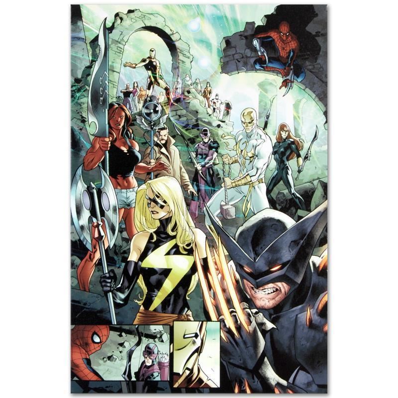 A piece of comic book history, this limited edition, from original art by Stuart Immonen, depicts classic Marvel characters. Stuart Immonen is a Canadian comic book artist. He is best known for his work on Nextwave, Ultimate X-Men, The New Avengers and Ultimate Spider-Man. Immonen studied at Toronto's York University, pursuing a career in art. In 1988, he self-published a series called Playground; it was his first published work. He worked at several smaller comic book companies before being hired by DC Comics and Marvel Comics in 1993. "Fear Itself #7" is a limited edition numbered giclee on stretched canvas by Stuart Immonen presented by Marvel Comics. This piece comes gallery wrapped. Includes Certificate of Authenticity! Measure approx. 18" x 27" (image); 1.5" (depth).