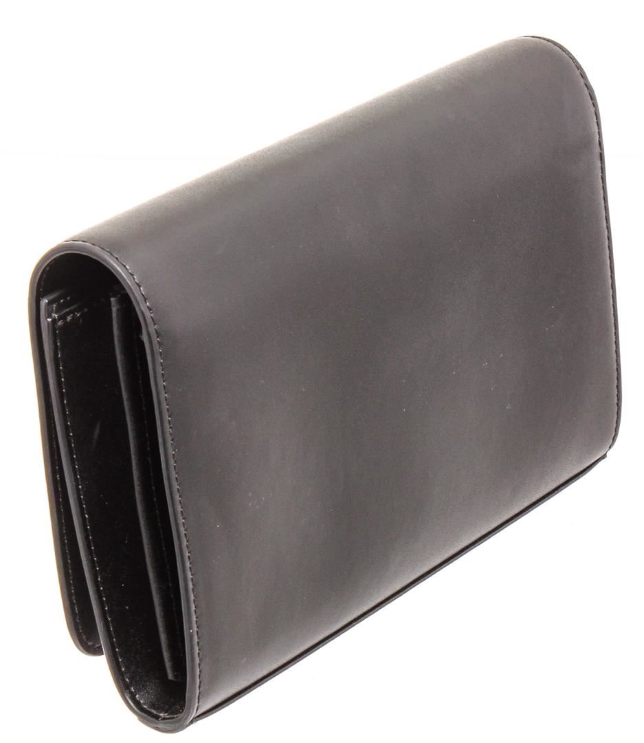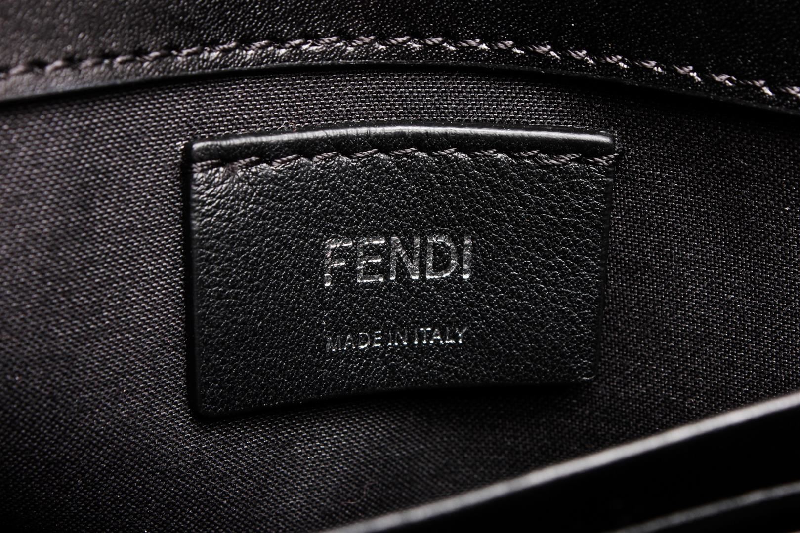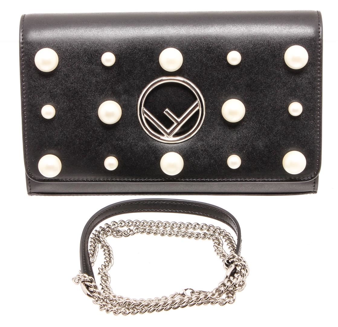 Fendi black leather pearl flap clutch with silver-tone hardware, optional detachable shoulder strap, pearl embellishments and Fendi logo placard at front flap, black canvas logo interior lining, three inside compartments, one zip pocket, ten card slots and overall snap closure at front.