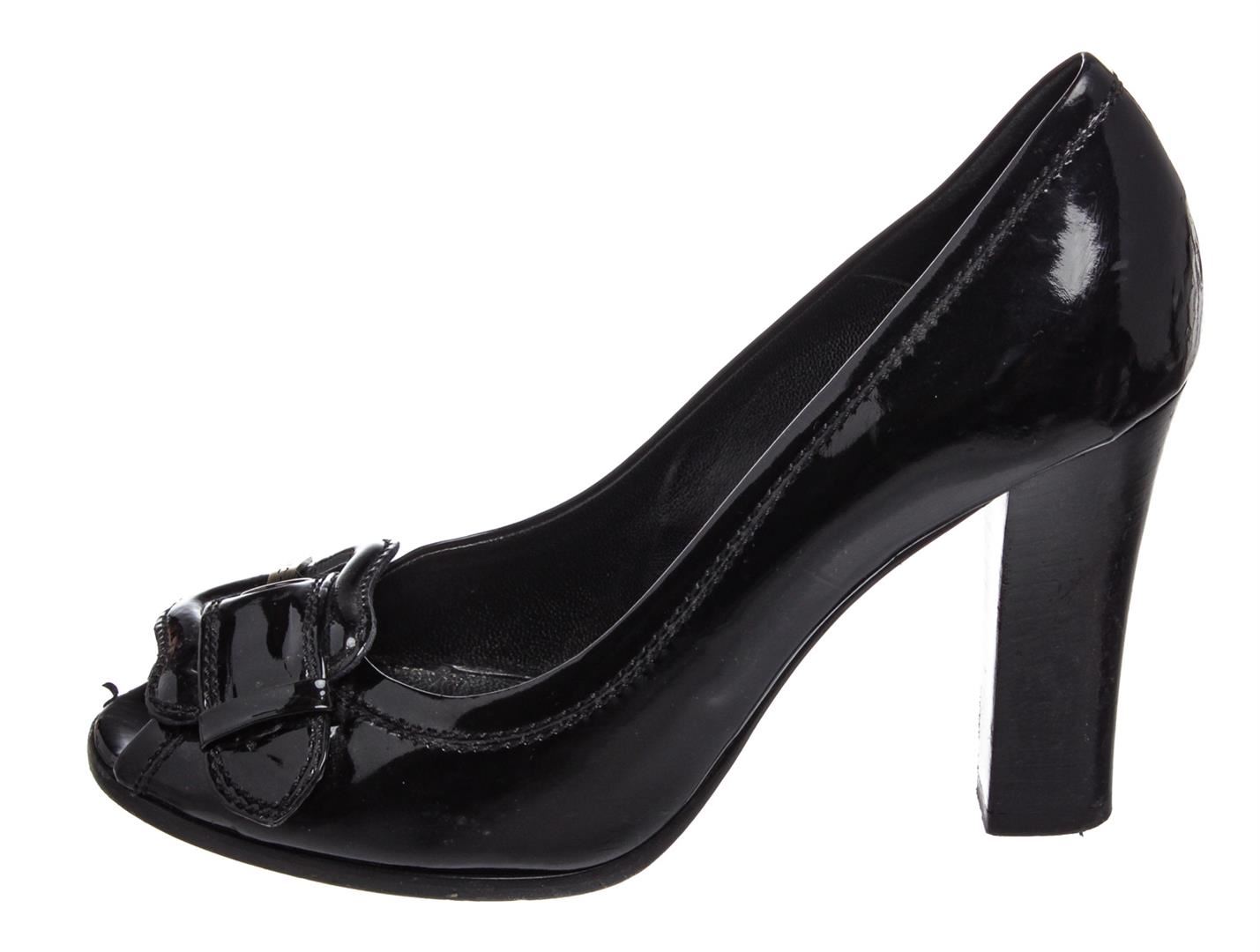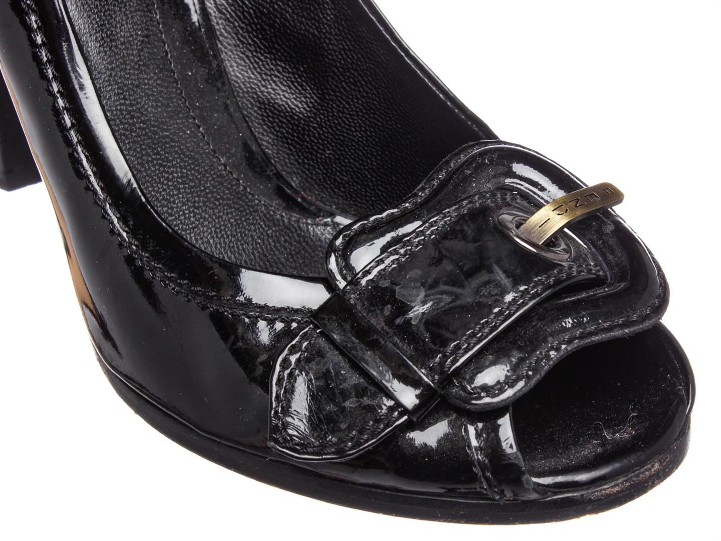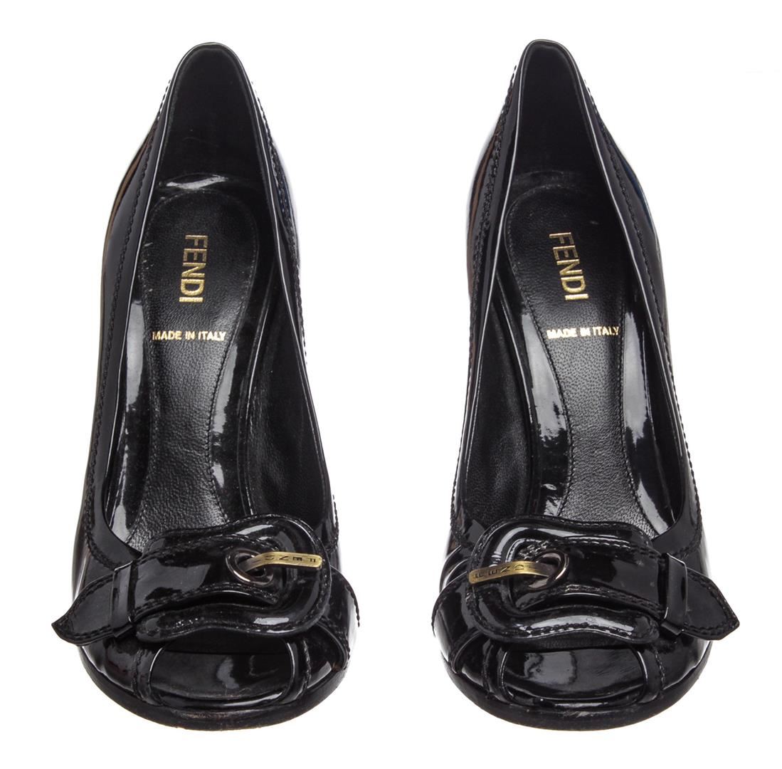 Fendi black patent leather peep toes with faux buckle embellishment, 3.5"x1" heel, designer size 36.5.