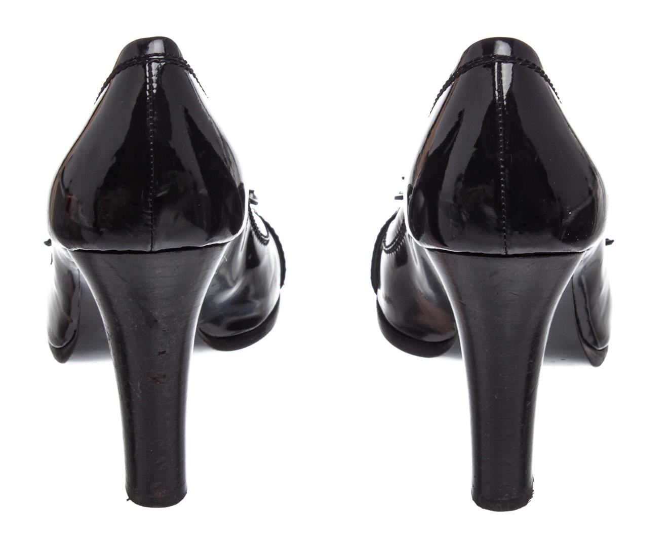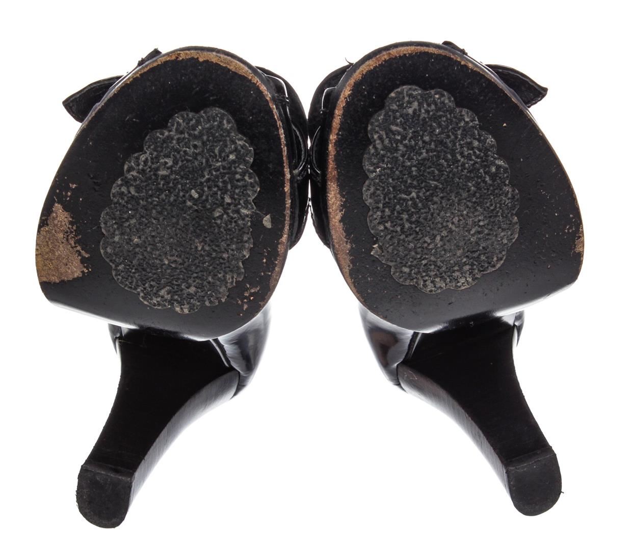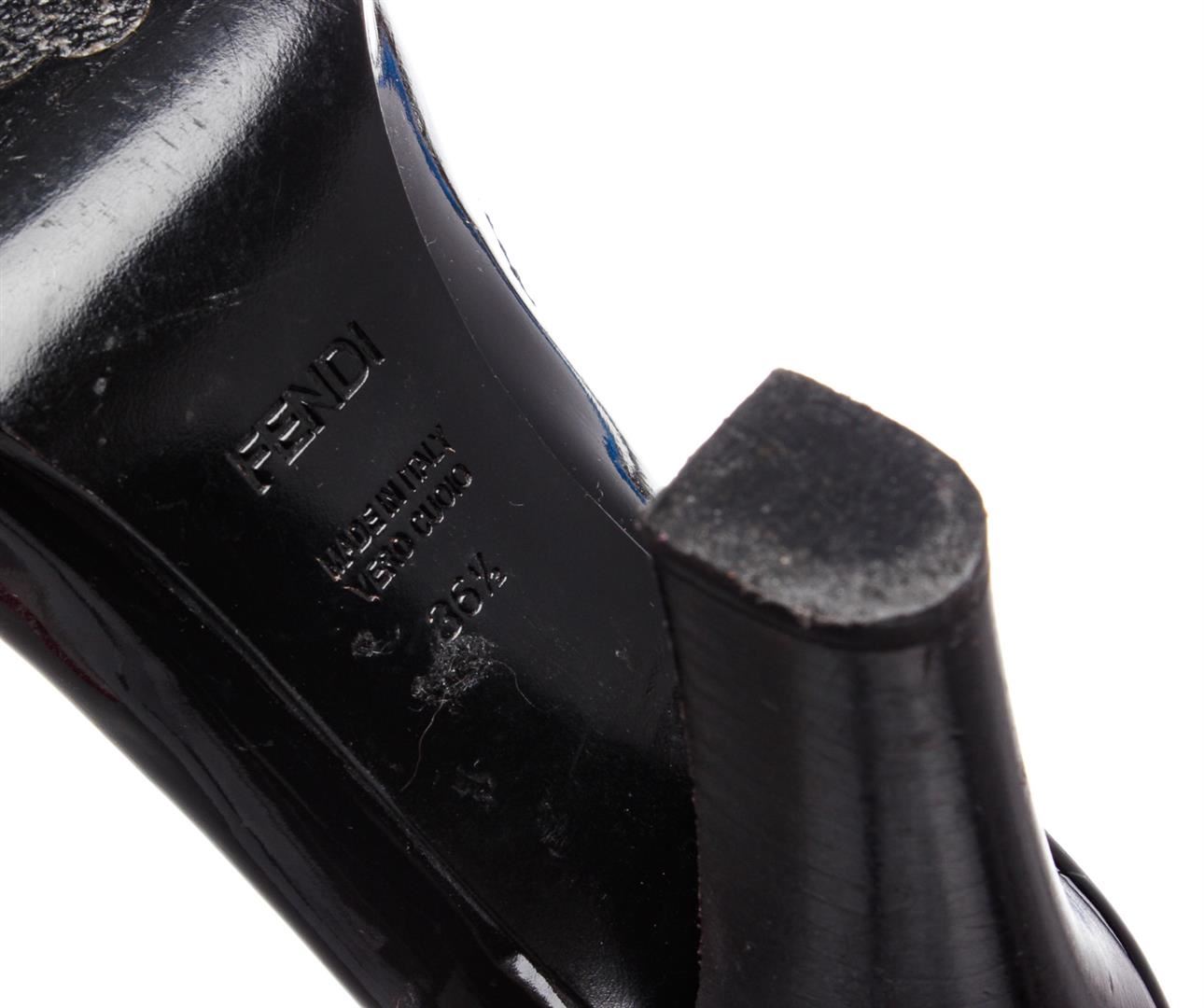 Fendi black patent leather peep toes with faux buckle embellishment, 3.5"x1" heel, designer size 36.5.