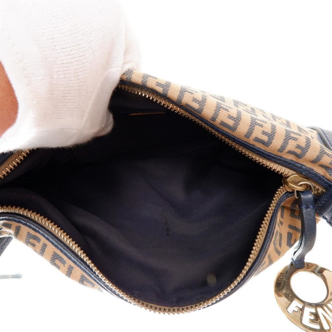 Fendi Brown Zucchino Canvas Leather Metal Round Logo Front Pocket Small Shoulder Bag. All available information is listed in the description and shown in the photos. Fendi Brown Zucchino canvas leather shoulder bag detailed with leather trimmed edges features round gold-tone metal logo, one front zipper pocket, single zip closure, top flat handle, canvas interior with a slip wall pocket, and gold-tone hardware. 12"x0.3"x6" SD:6"/30.5cmx1cmx15cm SD:15cm