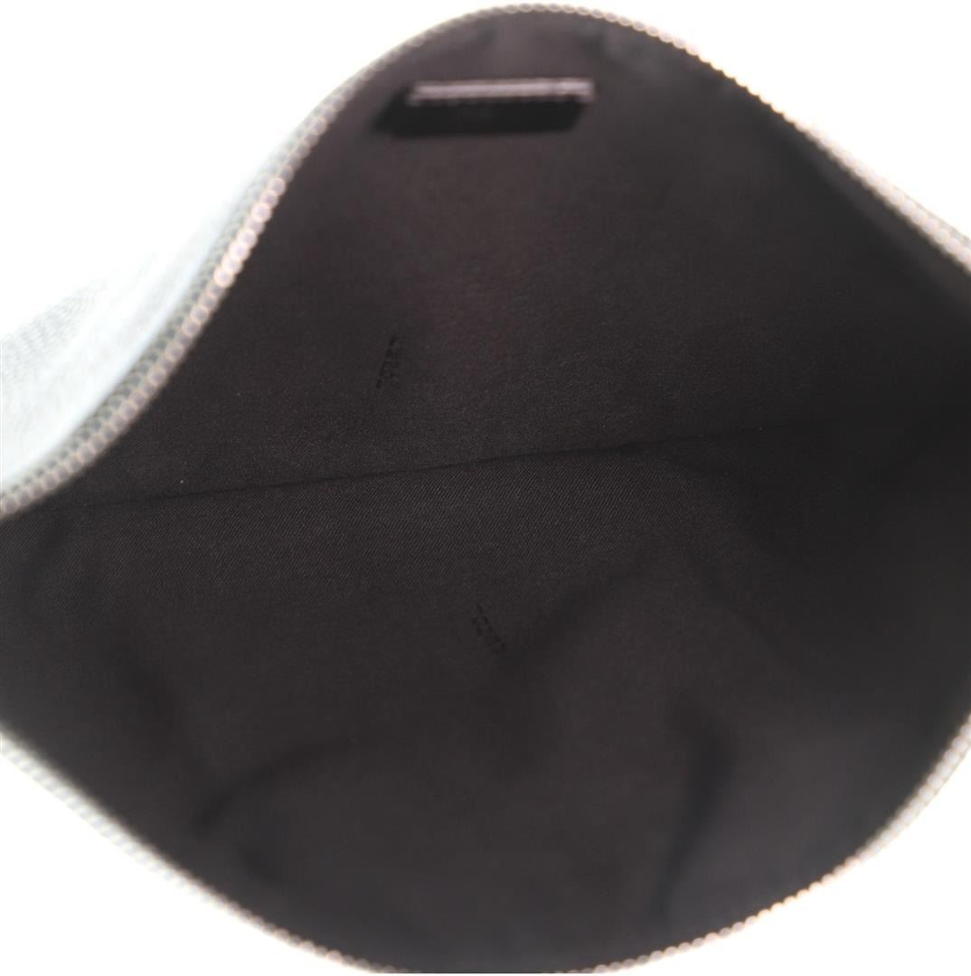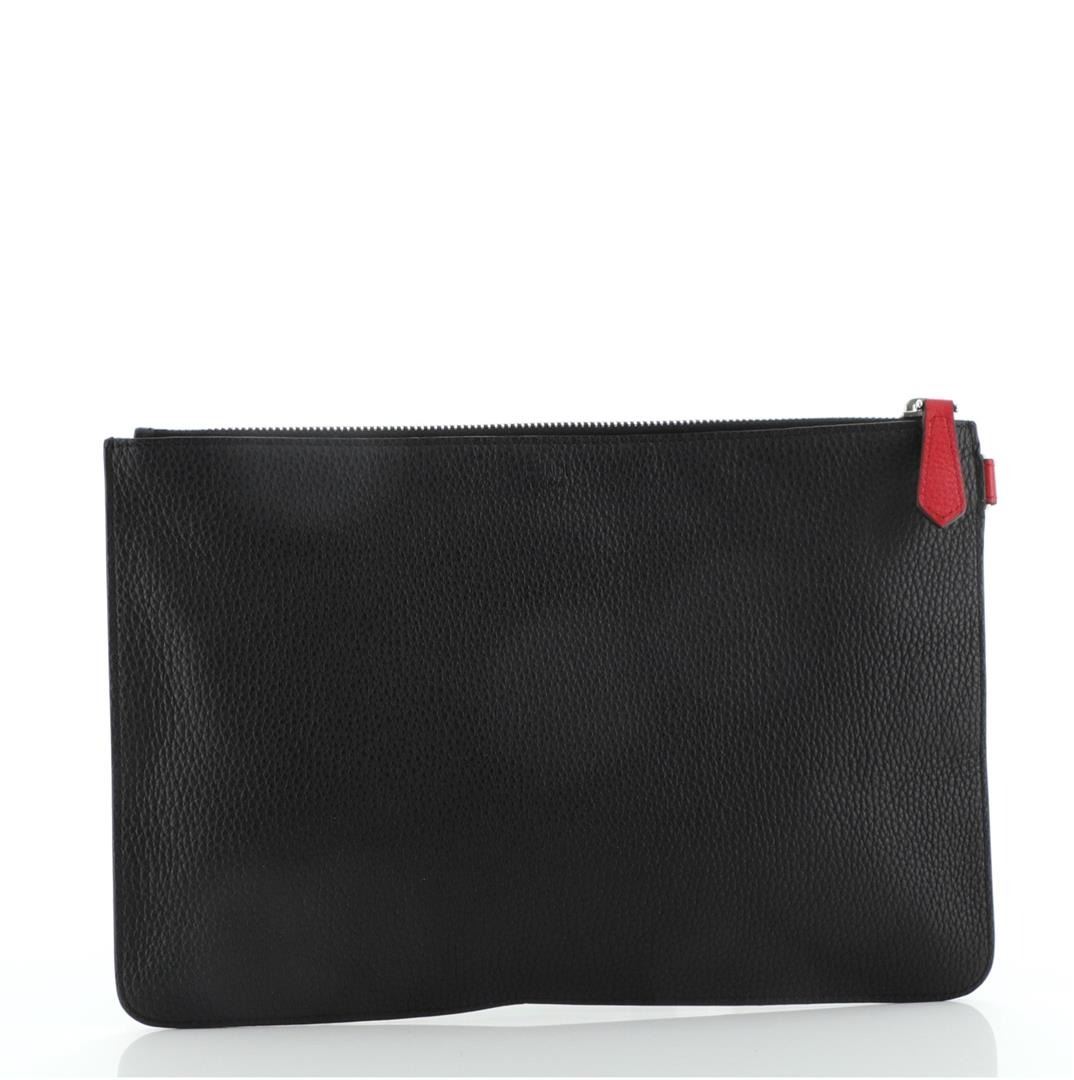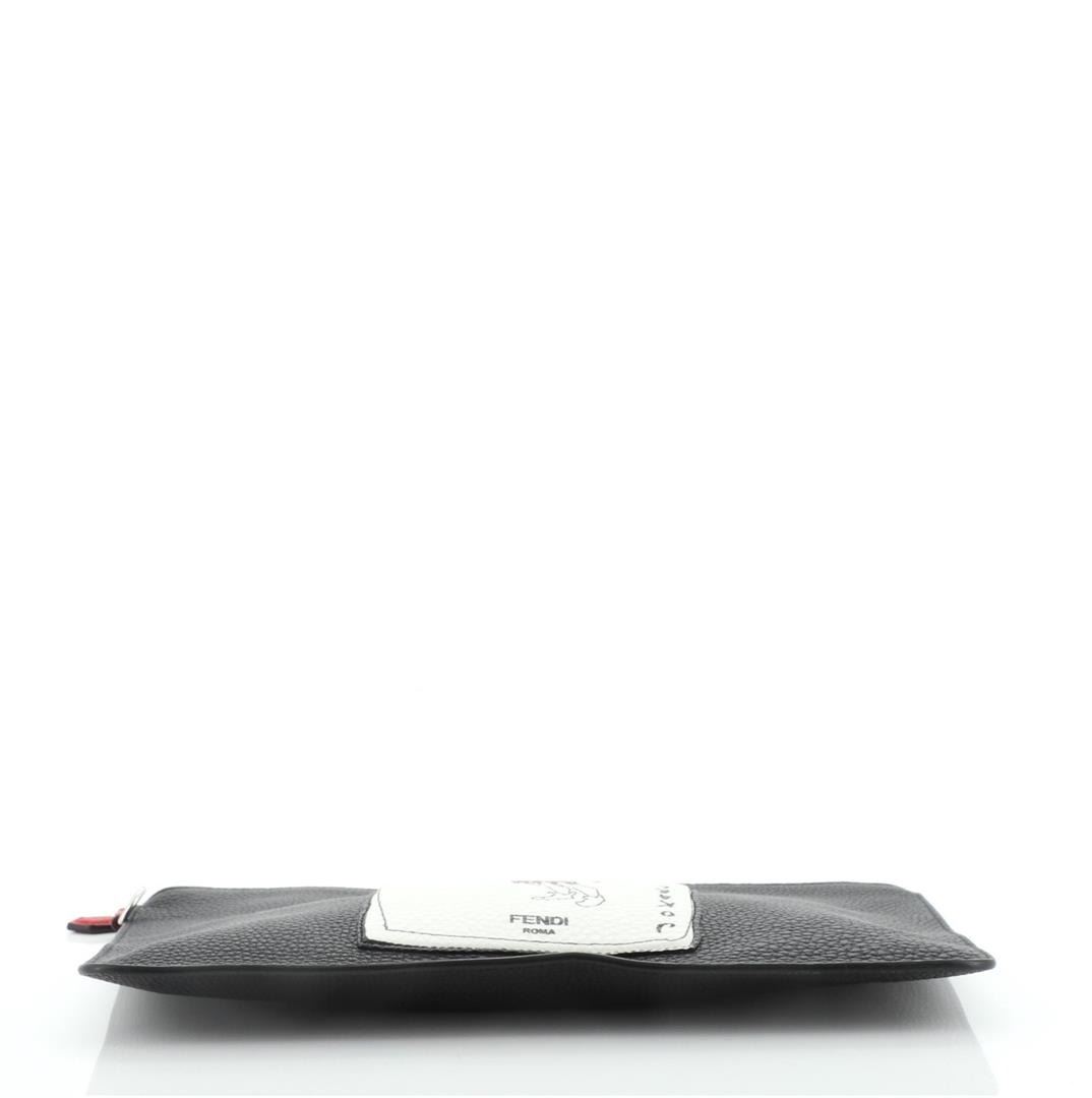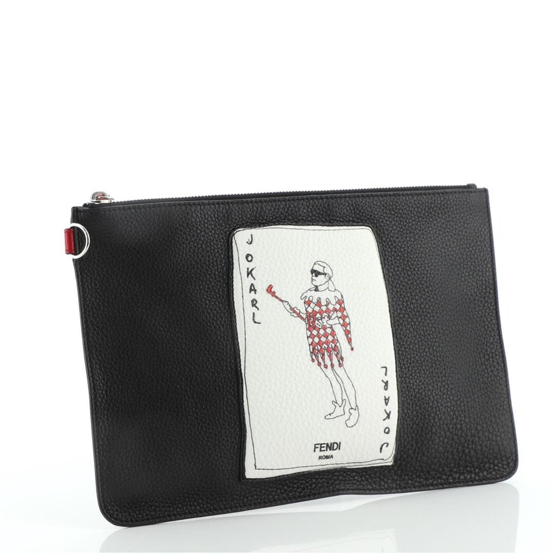 One Fendi Jokarl Pouch Printed Leather Medium Black. Item is sold AS-IS. All available information is listed in the description and shown in the photo. Fendi Jokarl Pouch Printed Leather Medium Black Condition Details: Marks and wear on front leather applique, scratches on hardware. Height 8", Width 11.5", Depth 0.5", Strap Drop None