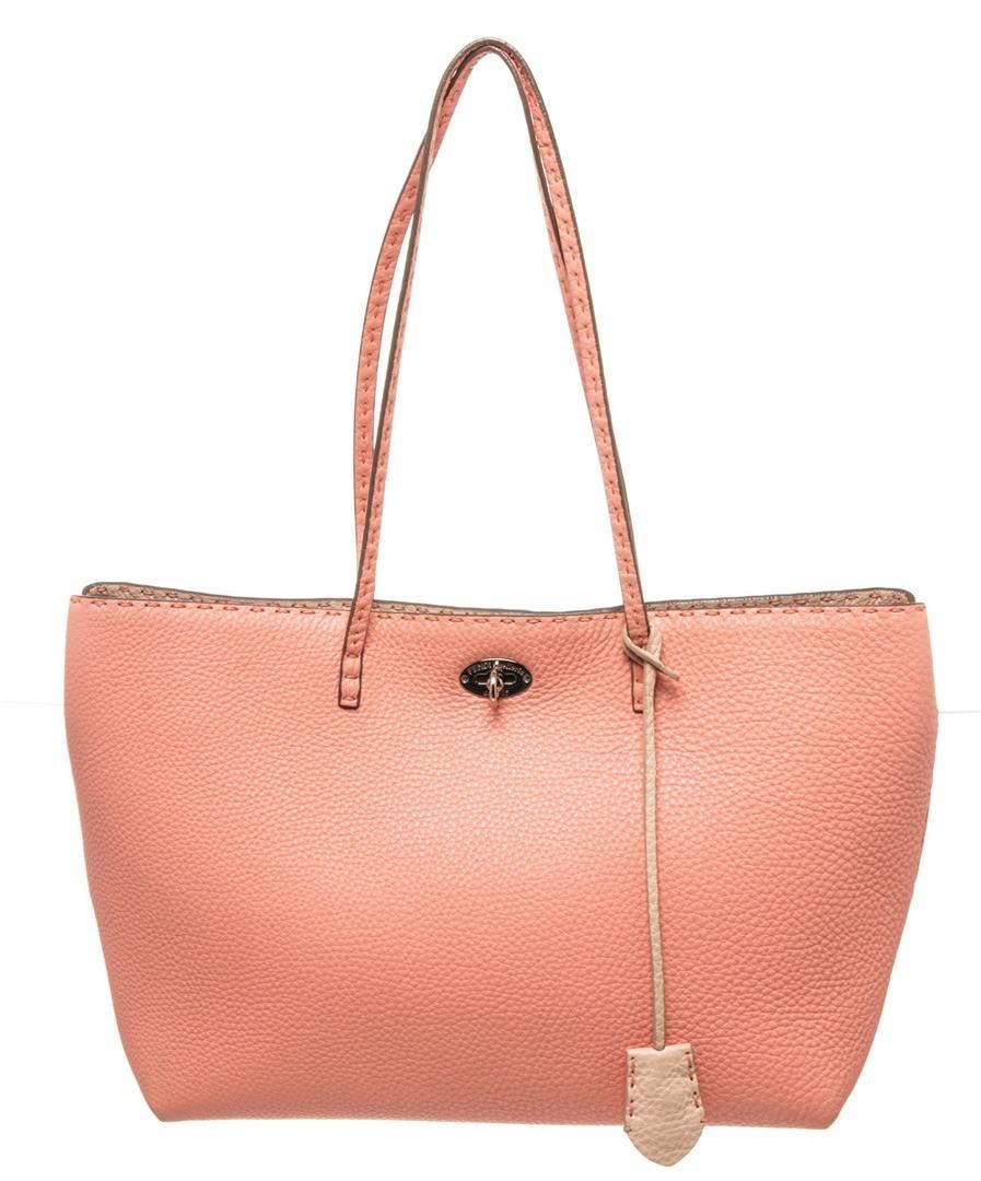 One Fendi Pink Leather Selleria Tote Bag. Item is sold AS-IS. All available information is listed in the description and shown in the photo. Fendi Pink Leather Selleria Tote Bag with gold-tone hardware, trim leather, shoulder strap and flap closure.