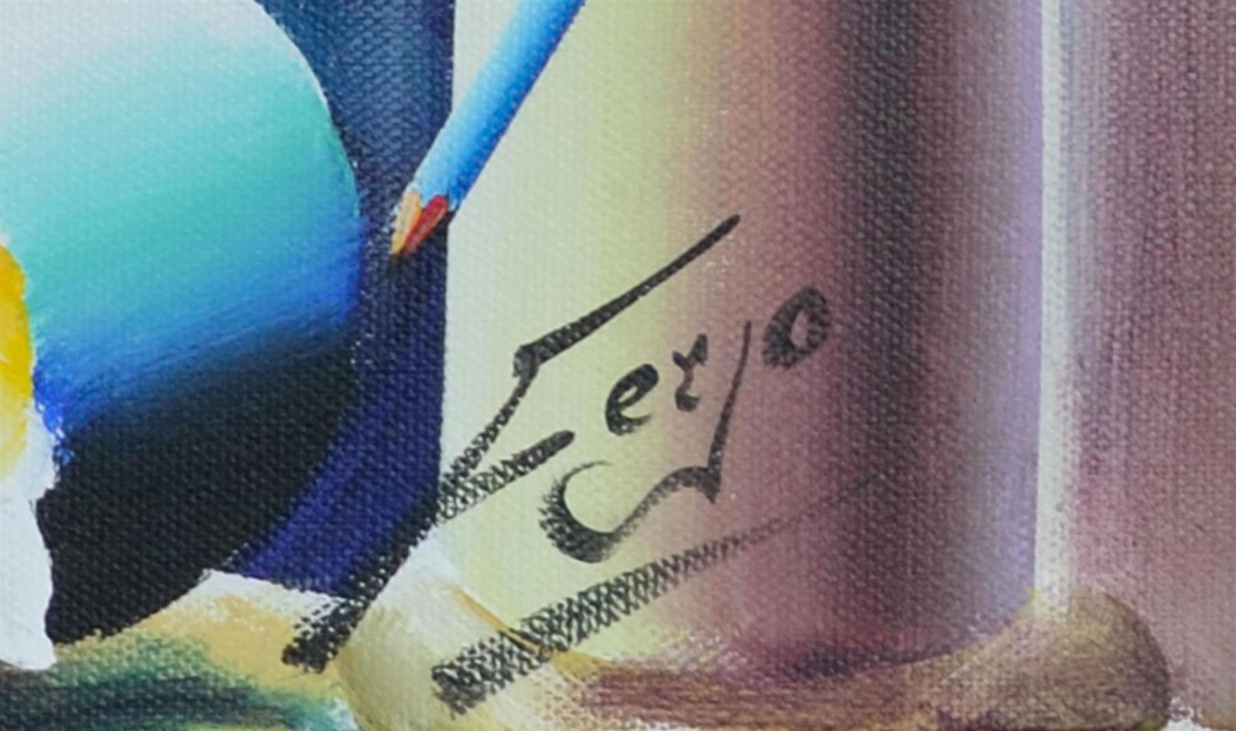 Artist: Ferjo (b. 1946) - Title: Amsterdam - Medium: Original Acrylic on Canvas - Signature:This one-of-a-kind work is hand-signed by the artist at the bottom of the image - Image Size: Approximately 24 inches x 30 inches - Stretched and Ready for Framing Canvas - Details: This work comes with a Certificate of Authenticity - Biography: Ferjo (b. 1946 - Fernando de Jesus Oliveira) is Brazilian, but lives in the U.S. now. A master of many different styles, he has become known for his work in surrealism. Dali and Magritte would be proud of this follower of theirs. Whether he is painting a room interior, complete with floating objects, or a marina scene his use of colors and lines is flawless.