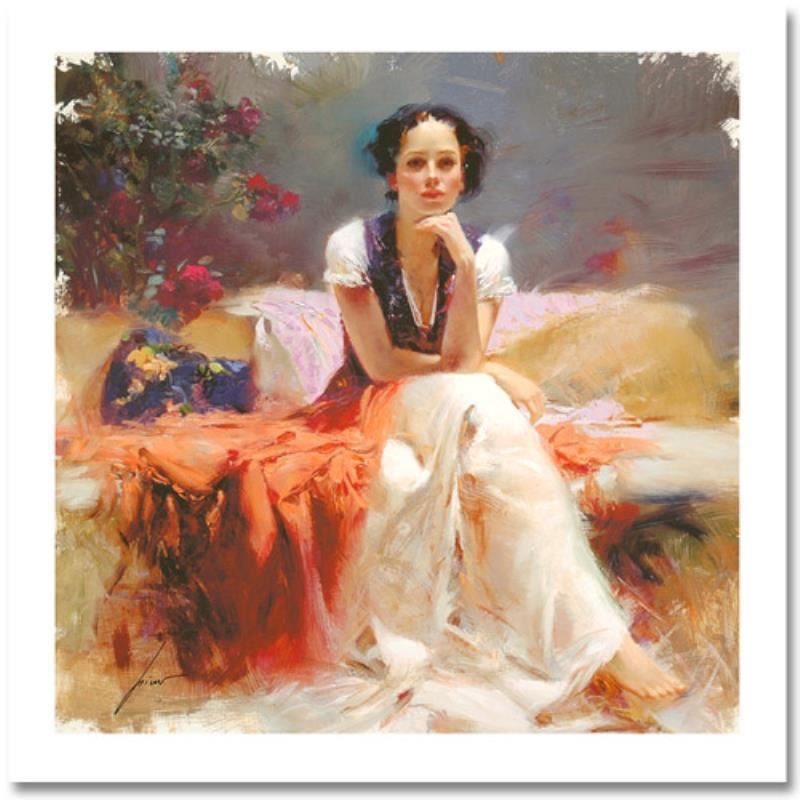 "First Glance" is a limited edition giclee on paper by Pino (1939-2010), numbered and hand signed by the artist. Includes Certificate of Authenticity. Measures approximately 16" x 16" (image).