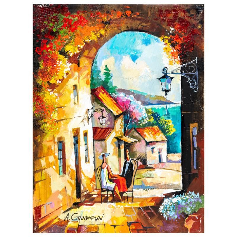 "First Time" is an original oil painting on stretched canvas by Alex Grinshpun, hand signed by the artist. Includes Letter of Authenticity. Measures approx. 12" x 16" (image). There is minor wear on the corners and edges that may be concealed when framed.
