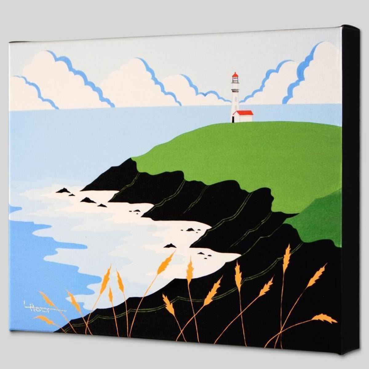 Larissa Holt, a student of distinguished artist Eyvind Earle (1916-2000), uses bold colors and breathtaking scenery to create images of Nature in her own unique style. "Fisherman's Lighthouse" is a limited edition giclee on stretched canvas by Holt, numbered and bearing Holt's authorized signature. This piece comes gallery wrapped. Includes Certificate of Authenticity! Measures approx. 12.5" x 10" x 1.5" (image).