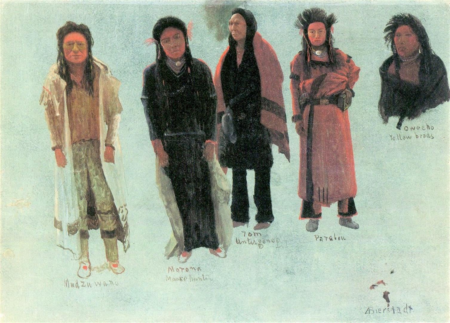 Artist: Albert Bierstadt - Title: Five Indians - Medium: Fine Art Giclee on Canvas - Image Size: Approximately 14.25 inches x 20 inches - Unframed on Unstretched Canvas - Biography: Bierstadt became internationally renowned for his beautiful and enormous paintings of the newly accessible American west, and his works found their way into public and private collections at staggeringly high prices for his time. His popularity and wealth rose to tremendous heights only to fade as the interest in the Boston School and impressionism turned public taste away from his highly detailed landscapes suffused with golden light. -