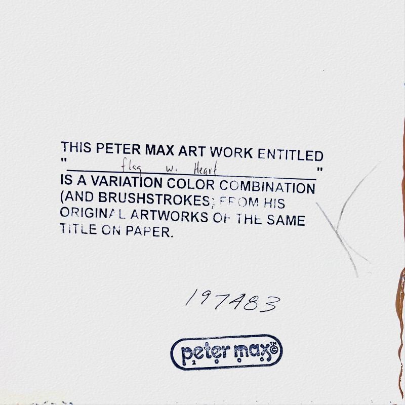 "Flag" is a one-of-a-kind mixed media on paper, hand signed by Peter Max. The piece comes custom framed with a backside cutout to display Peter Max Studio registration number 197483 certifying authenticity. Measures approximately 24" x 30" (frame), 18" x 24" (image).