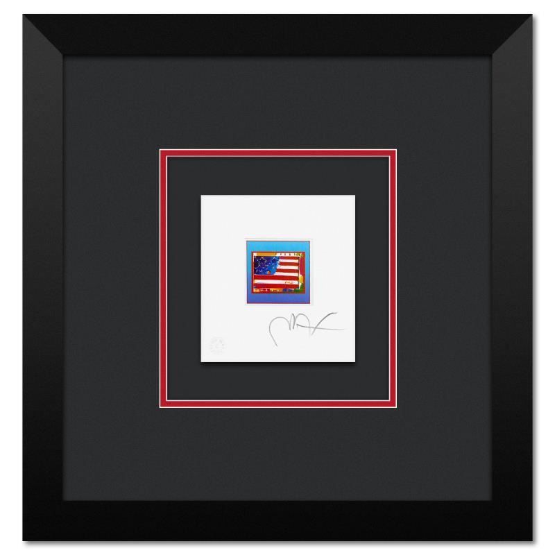 "Flag with Heart on Blue" is a limited edition lithograph on paper by Peter Max, numbered and hand signed by the artist. This piece comes framed. Includes Certificate of Authenticity from Peter Max Studios. Measures approx. 15" x 14.5" (frame), 5" x 4.5" (image).