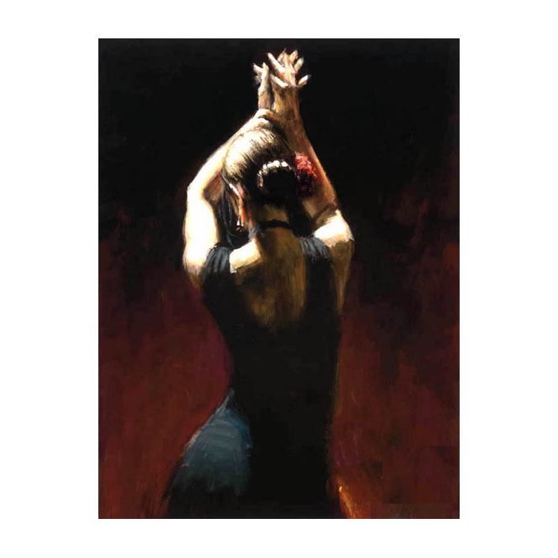 "Flamenco Dancer In Black" is a hand textured limited edition giclee on canvas board by Fabian Perez. The piece is numbered and hand signed. Includes a certificate of authenticity. Measures approximately 16.5" x 12.5"