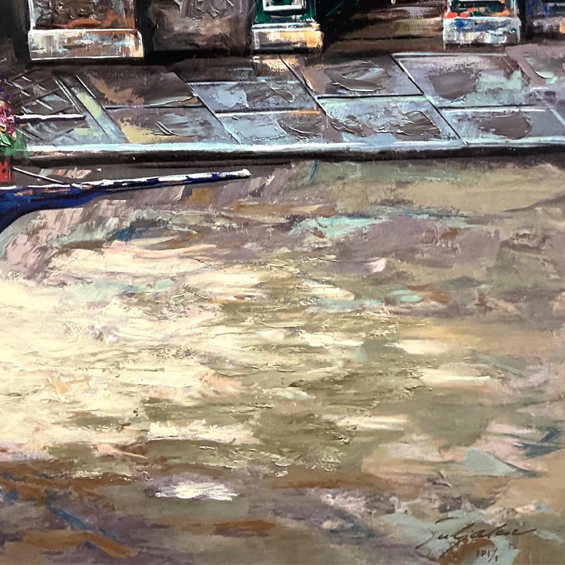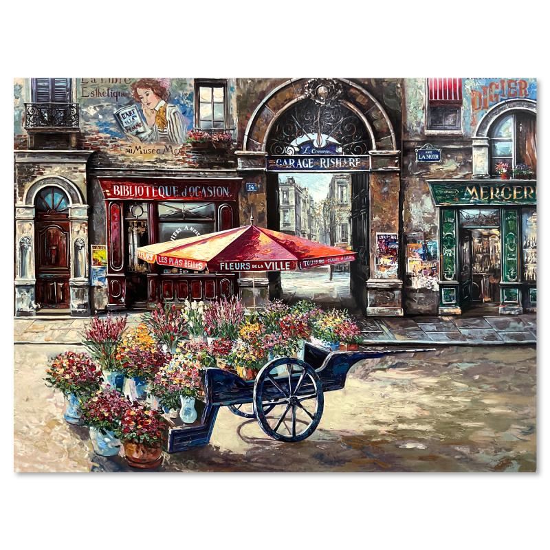 "Fleurs De La Ville" is a hand embellished limited edition printer's proof on stretched canvas by Vadik Suljakov, numbered inverso 1/1 and hand signed by the artist. Includes Letter of Authenticity. Measures approx. 36" x 48" (image). There may be minor wear on the corners and edges that will be concealed when framed.