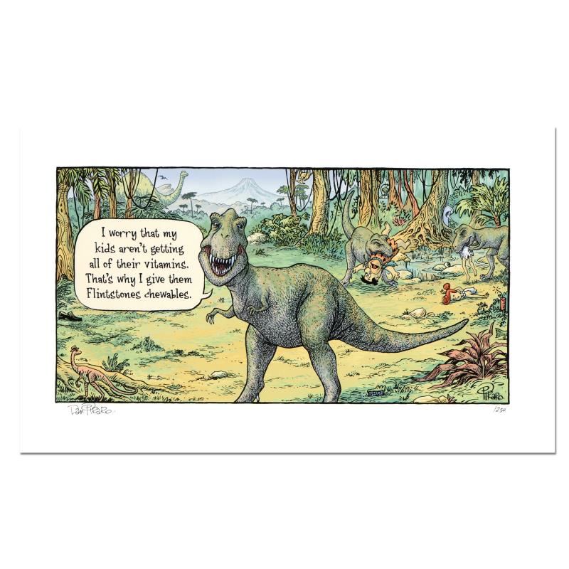 "Flintstones" is a limited edition giclee on paper by Dan Piraro, creator of the critically acclaimed and award winning comic strip, Bizarro! This piece is numbered and hand signed by the artist and includes aletterof authenticity. Measures approximtely 8" x 15" (image).