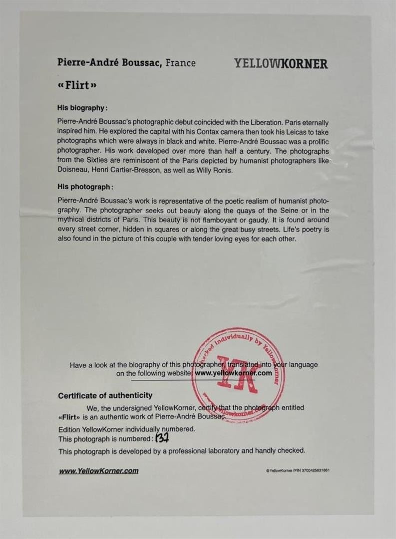 Flirt Black & White Photo Pierre-André Boussac France YellowKorner Certified Photograph. Certificate of Authenticity from YellowKorner affixed to the back. Matted Dimensions 16"x20". Protected with Clear Mylar Sleeve.