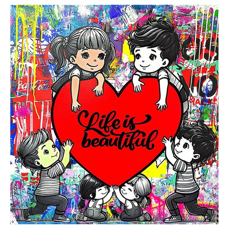 "Follow Your Heart" is a unique mixed media acrylic on gallery wrapped canvas by Jozza. This piece is hand signed and titled in verso. Includes Letter of Authenticity. Measures approximately 38" x 38" (image).