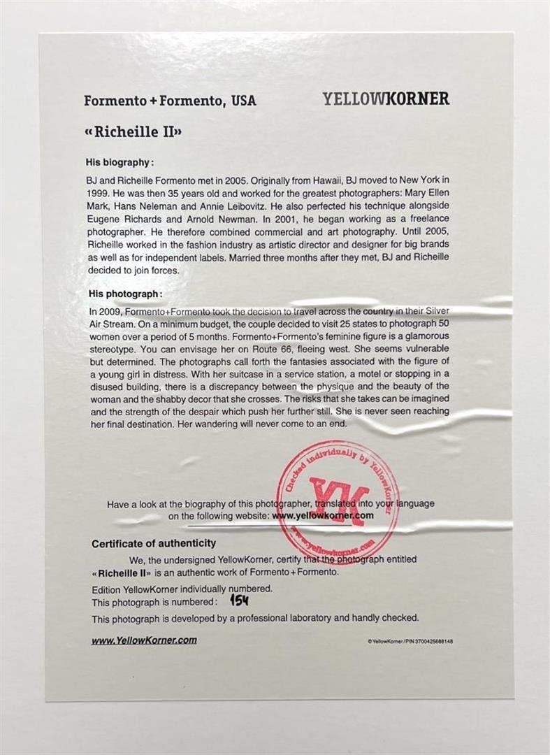 Formento + Formento Richeille II Female Traveler YellowKorner Certified Photograph. Certificate of Authenticity from YellowKorner affixed to the back. Matted Dimensions 16"x20". Protected with Clear Mylar Sleeve.