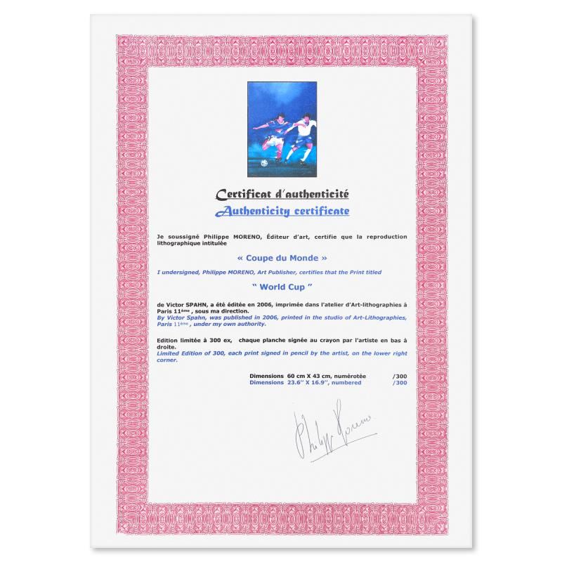 "France '98" is a limited edition lithograph on paper by Victor Spahn. Printed at Art-Lithographies workshop in Paris, the piece is hand signed by the artist and comes with a certificate of authenticity. Measures approximately 23.5" x 17" (image).