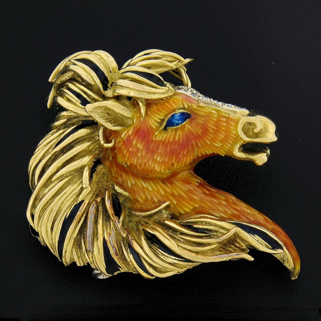 A solid 18k yellow gold and multi colors enamel work horse brooch by Frascarolo & Co. featuring 8 single cut natural diamonds (G/H- VS2-SI2 ; 0.12ctw). Measures 37.4x39.9mm and weighs a total of 39.57 grams.