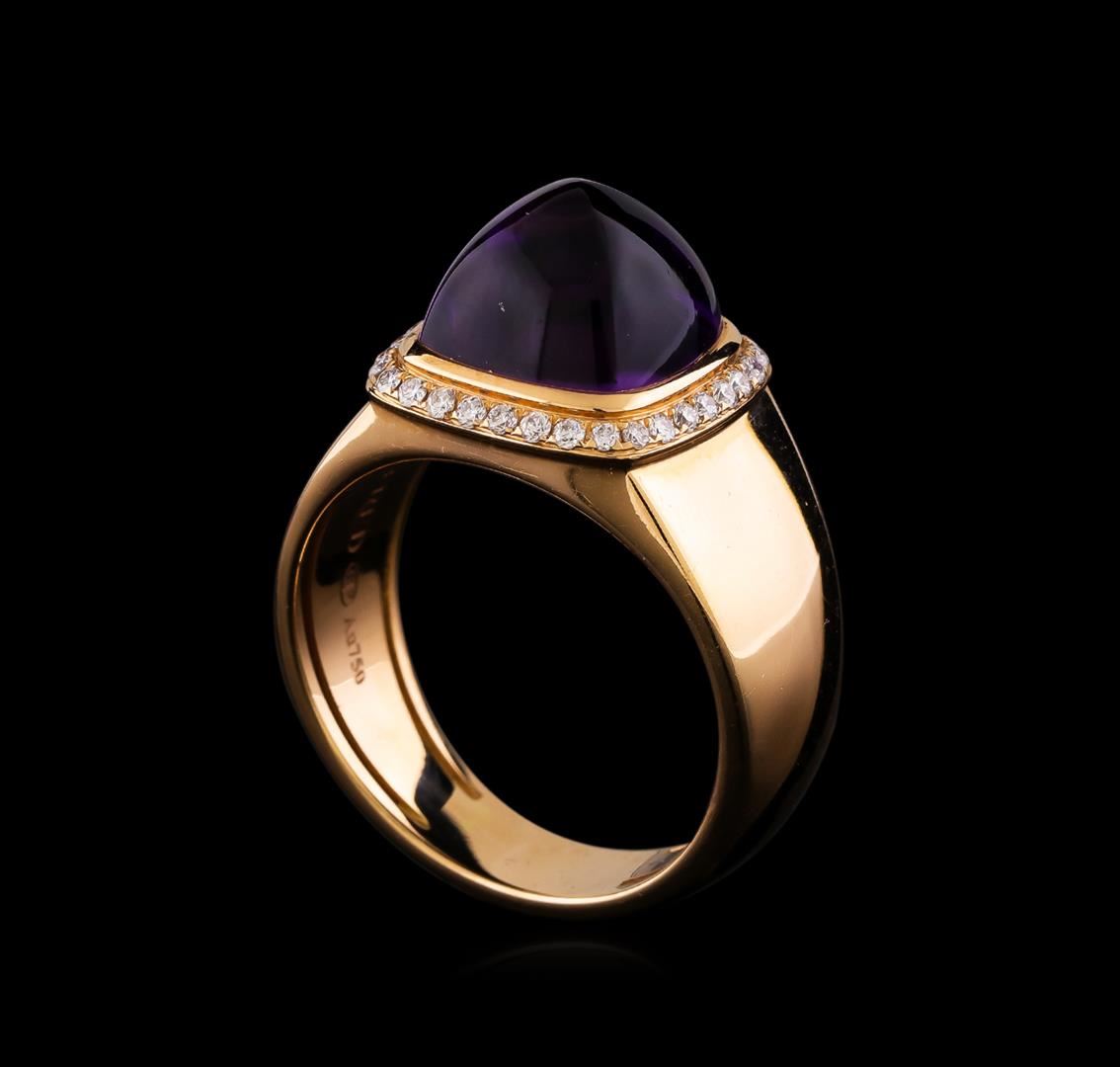 One electronically tested 18KT pink gold ladies cast & assembled amethyst and diamond ring with a bright polish finish. The Fred of Paris "Pain De Sucre" ring features a rose quartz cabochon set within a diamond bezel supported by tapering shoulders, completed by a five millimeter wide band. The ring is stamped 58 969557. Trademark is Fred of Paris. Identified with markings of "750". Condition is good. Containing: One bezel set square cabochon cut natural amethyst, measuring 10.30 x 10.30 x 7.00mm, approximate weight of 7.00ct., type II, medium dark, very slightly grayish, purple color, (GIA P 6/3), cut is good. Transmitting light with no distortion, transparent. Graded in the setting. Thirty-Two prong set round brilliant cut diamonds approximate total weight of 32 Stones = 0.20ct. Graded in the setting. Clarity VS-1 to VS-2. Color: E - F. Total Weight of Colored Stones 7.00ct.. Total Weight of Diamonds 0.20ct.. Total Weight of Ring 11.86gm. AIG Appraised.