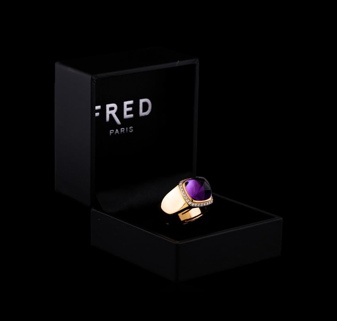One electronically tested 18KT pink gold ladies cast & assembled amethyst and diamond ring with a bright polish finish. The Fred of Paris "Pain De Sucre" ring features a rose quartz cabochon set within a diamond bezel supported by tapering shoulders, completed by a five millimeter wide band. The ring is stamped 58 969557. Trademark is Fred of Paris. Identified with markings of "750". Condition is good. Containing: One bezel set square cabochon cut natural amethyst, measuring 10.30 x 10.30 x 7.00mm, approximate weight of 7.00ct., type II, medium dark, very slightly grayish, purple color, (GIA P 6/3), cut is good. Transmitting light with no distortion, transparent. Graded in the setting. Thirty-Two prong set round brilliant cut diamonds approximate total weight of 32 Stones = 0.20ct. Graded in the setting. Clarity VS-1 to VS-2. Color: E - F. Total Weight of Colored Stones 7.00ct.. Total Weight of Diamonds 0.20ct.. Total Weight of Ring 11.86gm. AIG Appraised.