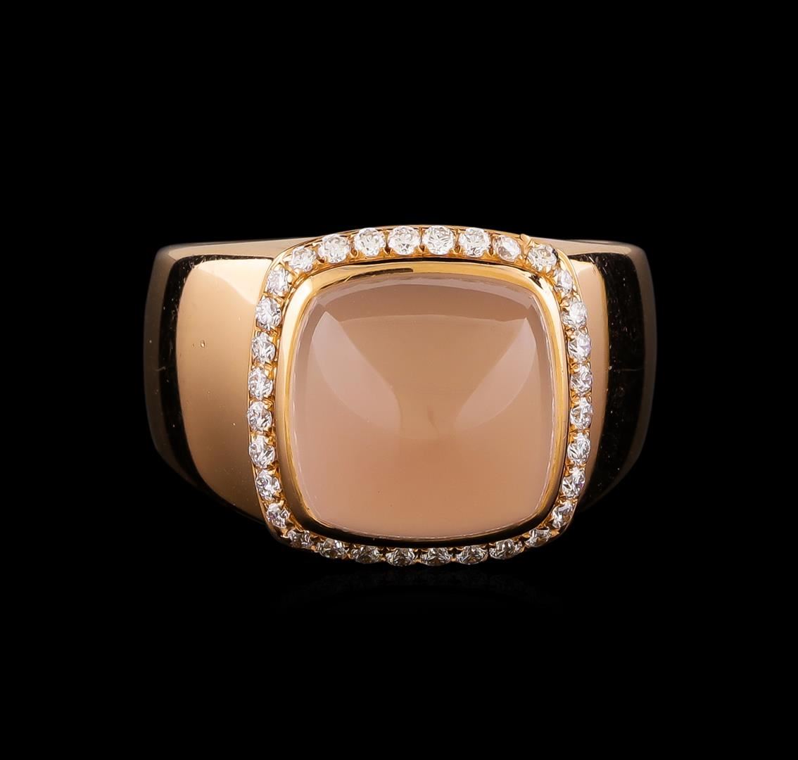 One electronically tested 18KT pink gold ladies cast & assembled rose quartz and diamond ring with a bright polish finish. The Fred of Paris "Pain De Sucre" ring features a rose quartz cabochon set within a diamond bezel supported by tapering shoulders, completed by a five millimeter wide band. The ring is stamped 531017090. Trademark is Fred of Paris. Identified with markings of "750". Condition is good. Containing: One bezel set square cabochon cut natural rose quartz, measuring 10.30 x 10.30 x 7.00mm, approximate weight of 7.00ct., very light, very slightly grayish, pink color, (GIA Pk 2/3), cut is good. Transmitting light somewhat diffusely, translucent. Naturally occurring internal & external characteristics are present. Graded in the setting. Thirty-Two prong set round brilliant cut diamonds approximate total weight of 32 Stones = 0.20ct. Graded in the setting. Clarity VS-1 to VS-2. Color: E - F. Total Weight of Colored Stones 7.00ct.. Total Weight of Diamonds 0.20ct.. Total Weight of Ring 10.84gm. AIG Appraised.