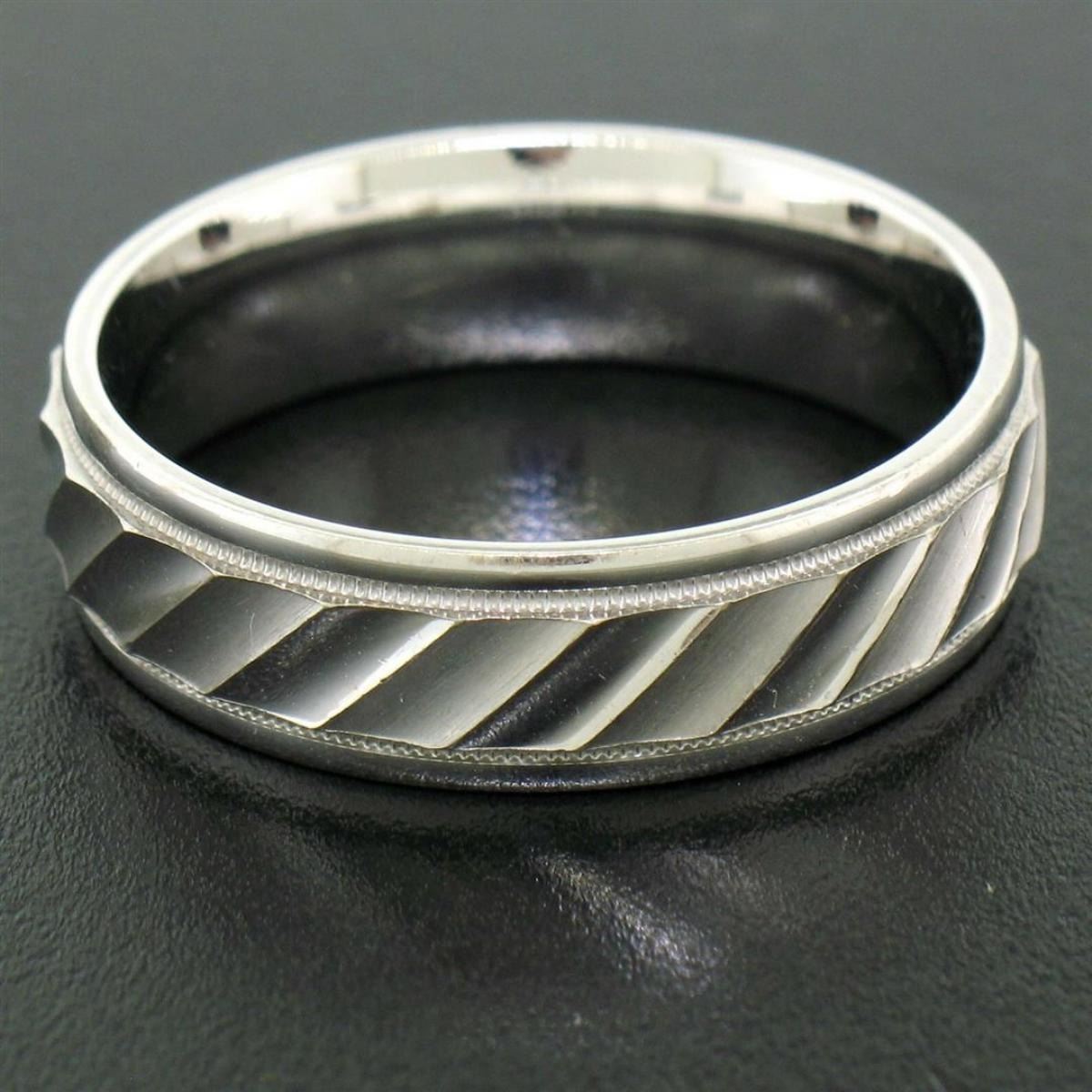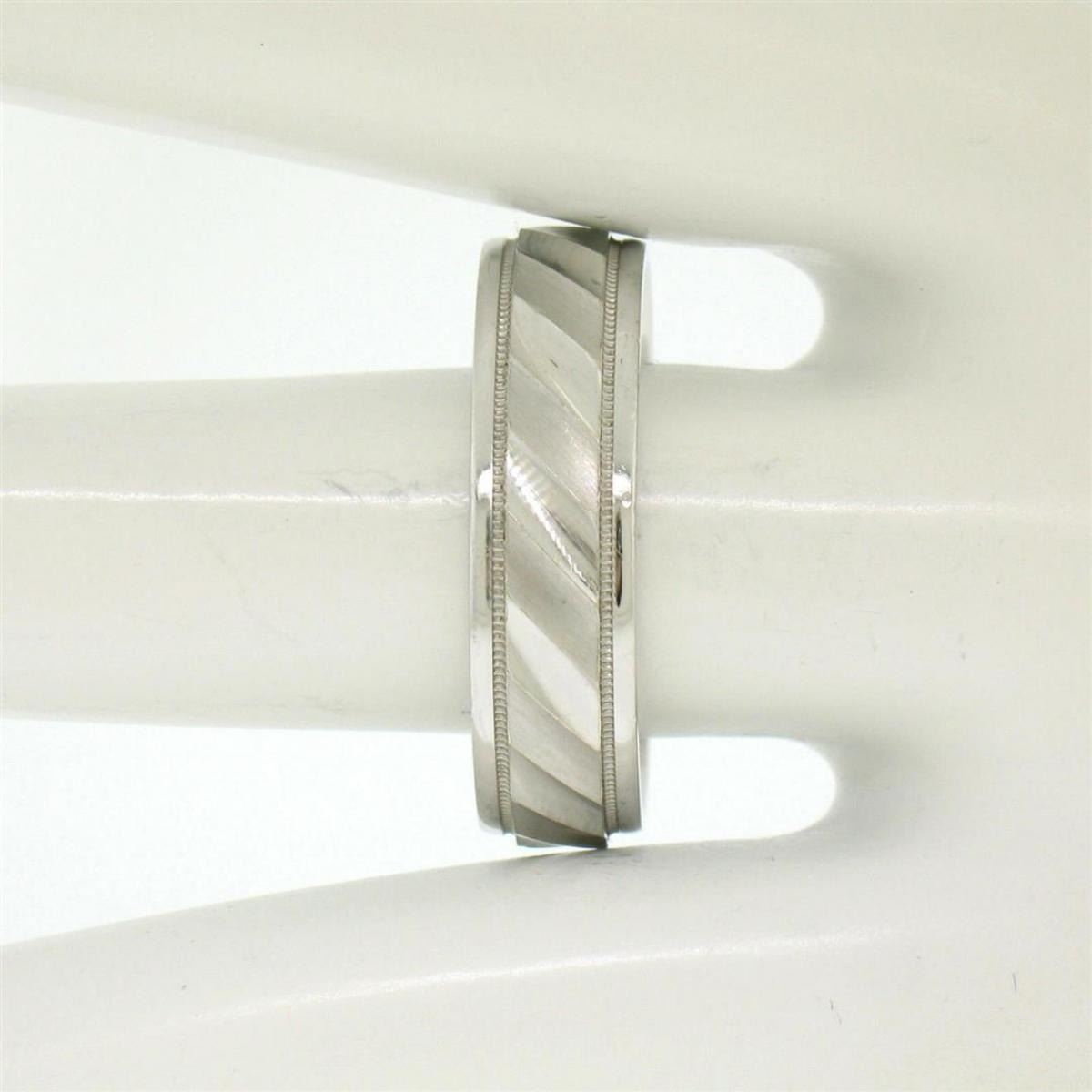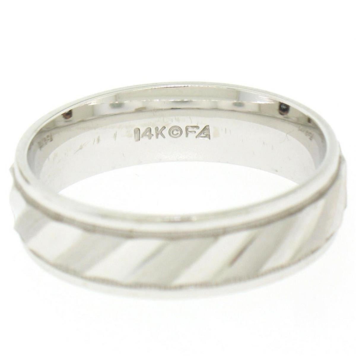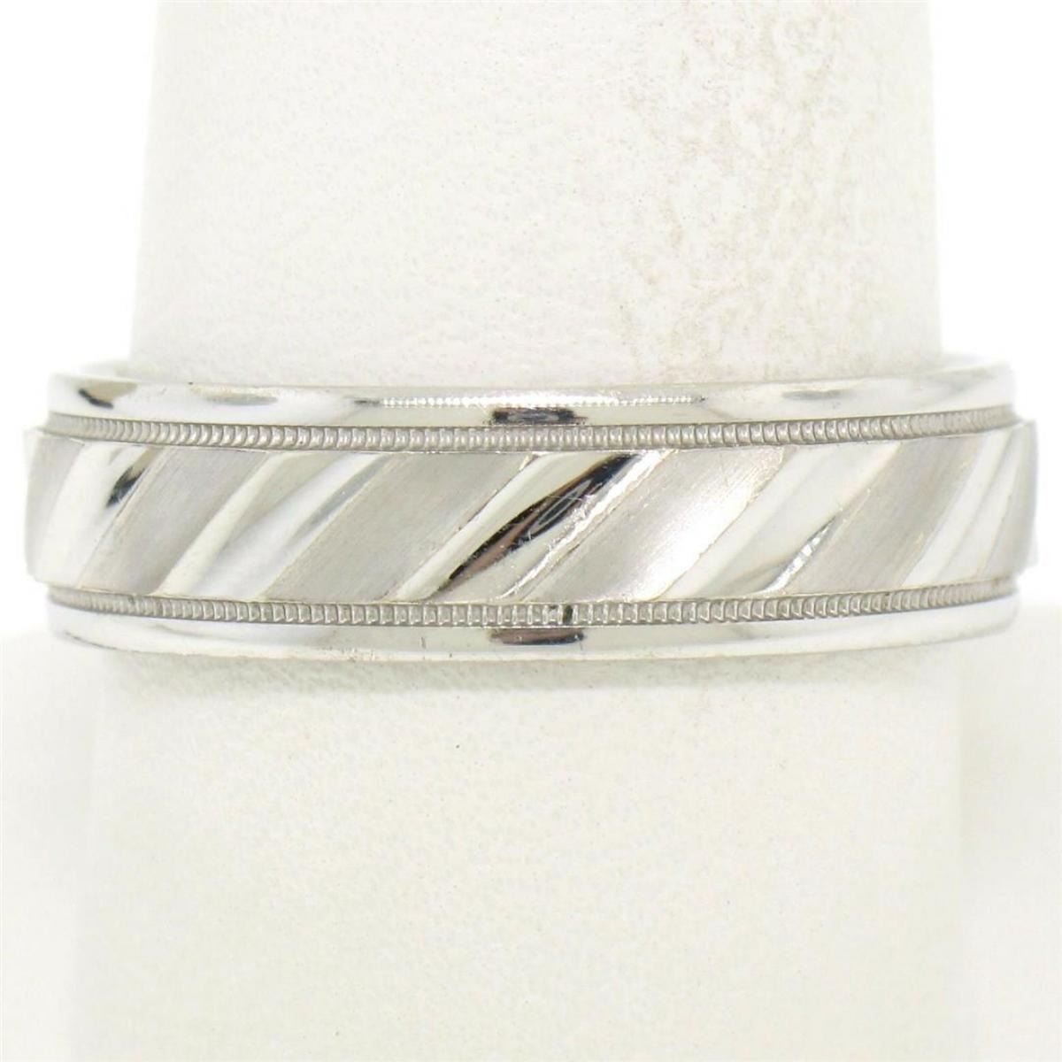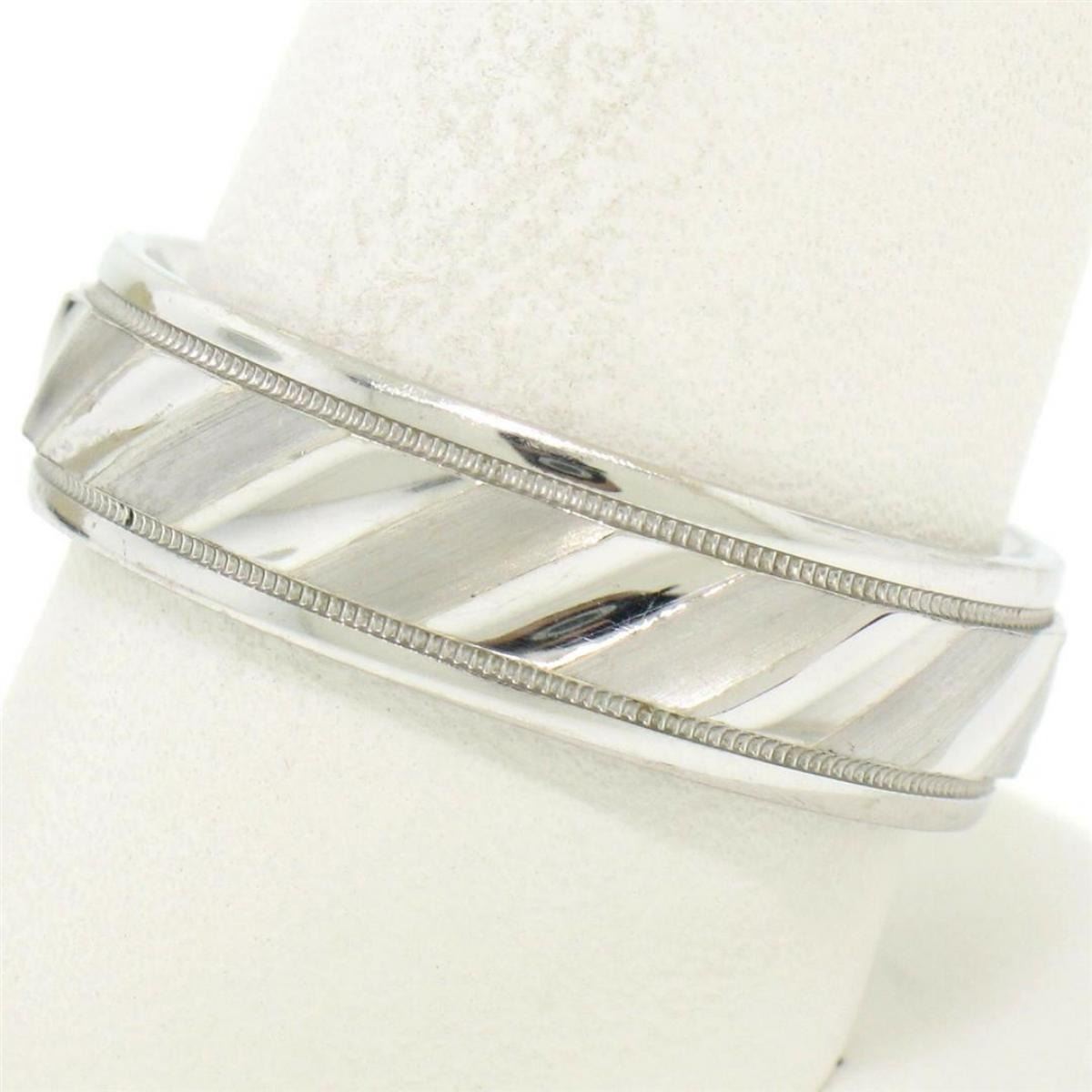 One Frederick Goldman Men's 14K White Gold 6.1mm Dual Textured Ribbed Milgrain Eternity Band Ring. Item Details: Material: 14K Solid White Gold, Weight: 7.0 Grams, Ring Size: 9.5 (We CANNOT custom size this ring.), Ring Width: 6.10mm, Ring Height: 2.0mm rise off the finger, Signature: 14K©FG, Condition: Like New!