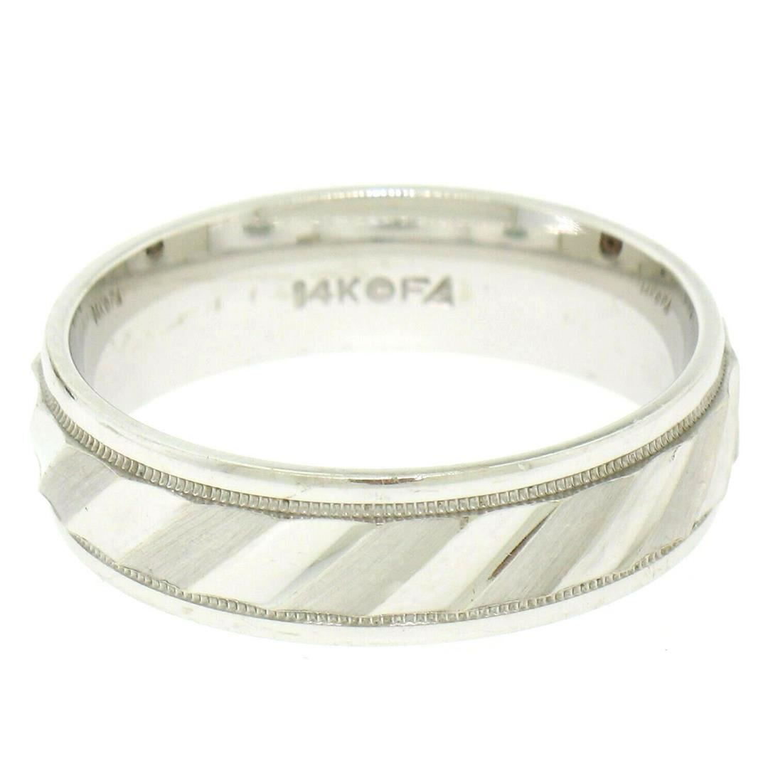 One Frederick Goldman Men's 14K White Gold 6.1mm Dual Textured Ribbed Milgrain Eternity Band Ring. Item Details: Material: 14K Solid White Gold, Weight: 7.0 Grams, Ring Size: 9.5 (We CANNOT custom size this ring.), Ring Width: 6.10mm, Ring Height: 2.0mm rise off the finger, Signature: 14K©FG, Condition: Like New!