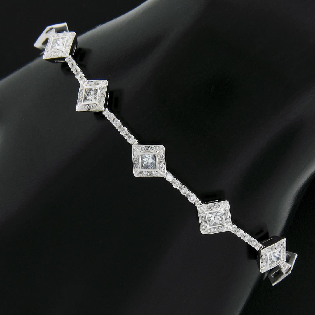 A solid 18k white gold line bracelet, featuring 12 princess cut natural diamonds (H/I - VS1/VS2 ; 1.50ctw), and 139 round cut natural diamonds (1.50ctw). It weighs a total of 12.90 grams, measures 7.8mm wide, and measures 7.0 inches in length.