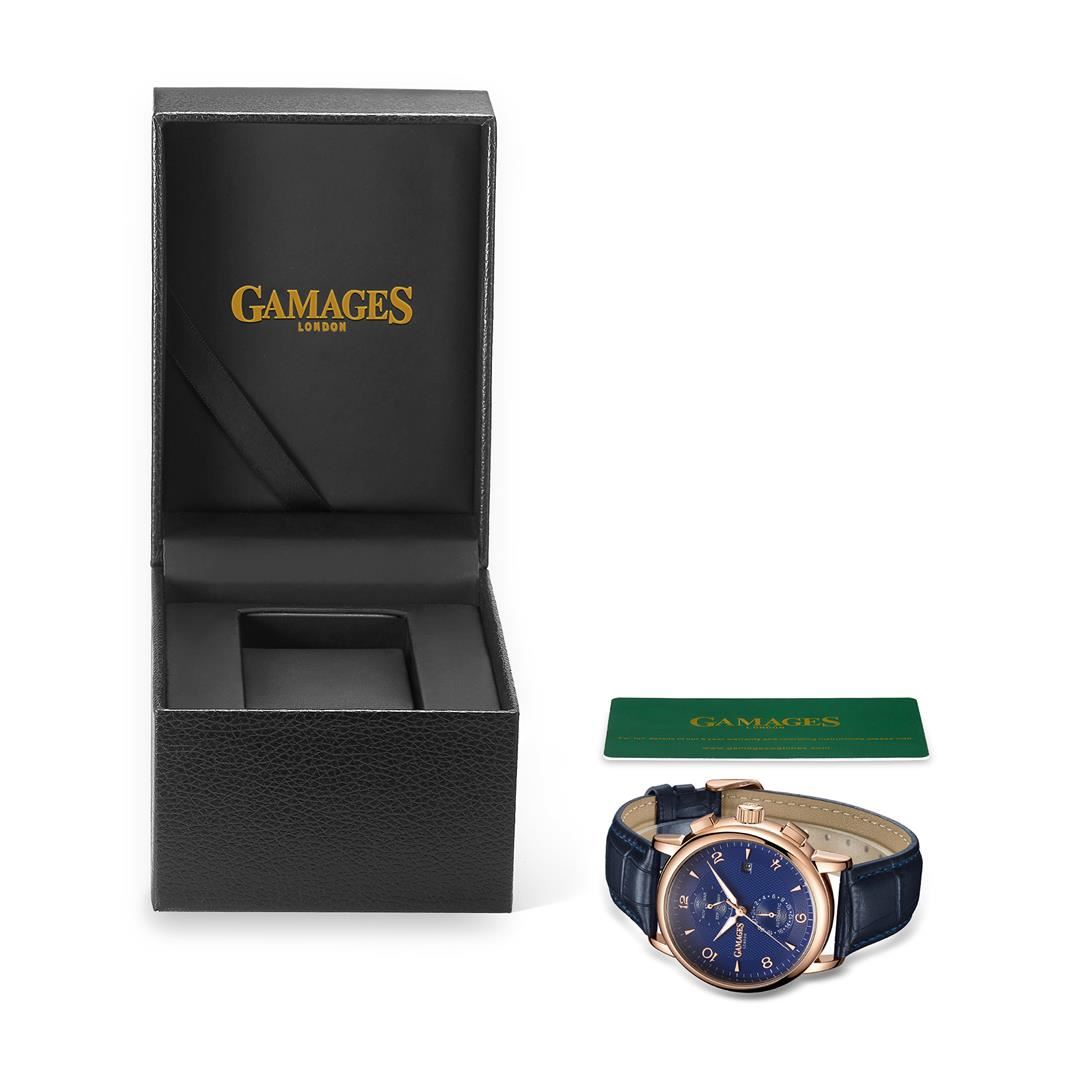 Mysteries have always intrigued the Great British Public, and the Gamages Mystique Automatic encompasses the secrets that often lie under our noses. It is inspired by the Prince of Paradox GK Chesterton, who captured the imaginations of readers throughout their lifetime, and it is a testament to the quality that such works are still beloved today. With a cool indigo blue face that blends in wonderfully with a hand waxed leather strap, the Gamages Mystique Automatic inspires images of contradictory twilight secrets emerging from the shadows. It is complemented by sharp minute and hour hands, representing the eye for detail of our favorite detectives, and it operates with 163 part 20 jewel hand assembled movements along with Day, Date, and 24 Hour functions. These guide you to the clues and reveal the solution that, once uncovered, seems so obvious. It is housed in a rose gold casing with a stainless steel tinted skeleton caseback that harks back to the suggestion that Chesterton could be considered the Forefather of Steampunk. Much like our favorite mysteries, such a design delivers the satisfaction that all great detectives spend their lives searching for. Model Specifications - Hand Assembled 163 Piece 20 Jewel Automatic Movement - Tinted Full Skeleton Stainless Steel Caseback - Day, Date & 24 Hour Functions - Scratch Resistant Mineral Glass - Water Resistant 3ATM - Hand Waxed Leather Strap - Shock Resistant - Antimagnetic - Nickel Free & Hypoallergenic - IP Plating Watch Dimensions - Case 43mm - Thickness 15mm - Strap Width 22mm - Strap Length 220mm - Lug Width 22m - Weight 78g