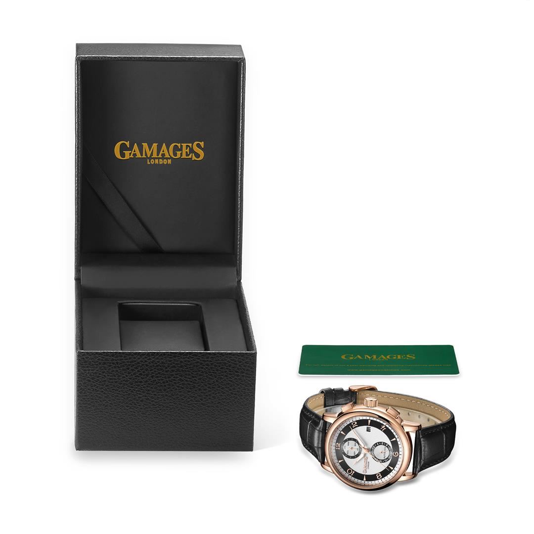 Mysteries have always intrigued the Great British Public, and the Gamages Mystique Automatic encompasses the secrets that often lie under our noses. It is inspired by the Prince of Paradox GK Chesterton, who captured the imaginations of readers throughout their lifetime, and it is a testament to the quality that such works are still beloved today. With a contrasting charcoal black and cloud-grey face that is distinctive alongside the hand waxed black leather strap, the Gamages Mystique Automatic lends to the idea that there is always light, and therefore answers, within the darkness. It is complemented by sharp minute and hour hands that represent a detective's cunning eye for detail, and operates with 163 part 20 jewel hand assembled movements along with Day, Date, and 24 Hour functions. These guide you to the answer that, once uncovered, seem so obvious. It is housed in a rose gold casing, with a stainless steel tinted skeleton caseback that harks back to the suggestion that Chesterton could be considered the Forefather of Steampunk. Much like our favorite mysteries, such a design delivers the satisfaction that all great detectives spend their lives searching for. Model Specifications - Hand Assembled 163 Piece 20 Jewel Automatic Movement - Tinted Full Skeleton Stainless Steel Caseback - Day, Date & 24 Hour Functions - Scratch Resistant Mineral Glass - Water Resistant 3ATM - Hand Waxed Leather Strap - Shock Resistant - Antimagnetic - Nickel Free & Hypoallergenic - IP Plating Watch Dimensions - Case 43mm - Thickness 15mm - Strap Width 22mm - Strap Length 220mm - Lug Width 22m - Weight 78g