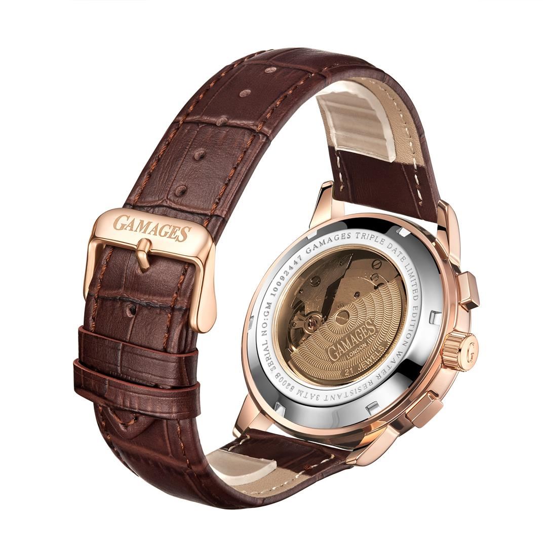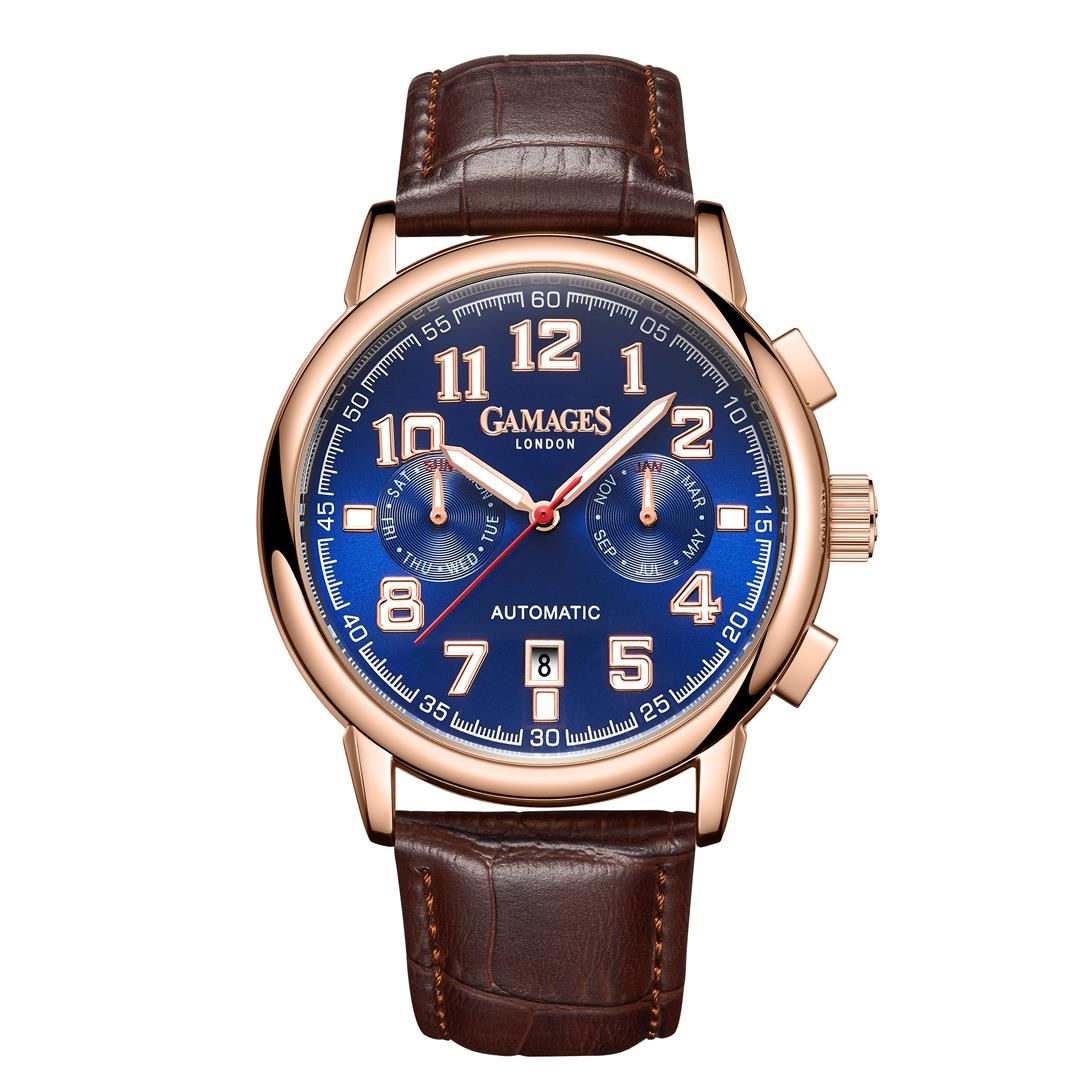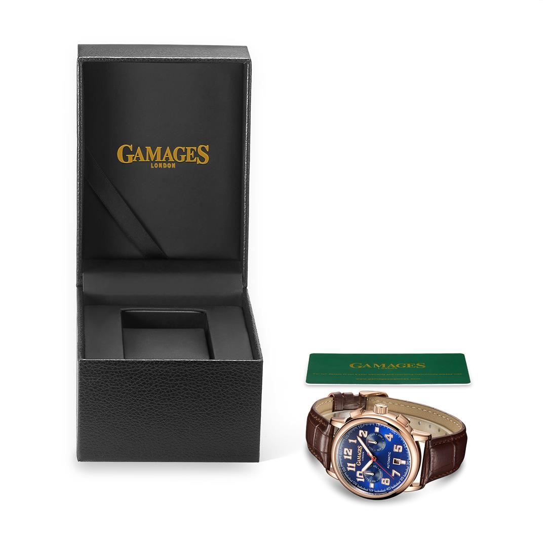 One of Britain's most renowned naval victories, The Battle of Trafalgar, is now commemorated in this beautifully hand assembled, limited edition timepiece which takes its inspiration from the Royal Navy. The deep blue of the face emulates the sea's mysterious depths, while the two sub dials reflect ship portholes, with a sea blue colouring. The white numerals and hands contrast vibrantly, while the calendar display is easy to read at a single glance. This luxury watch is also furnished with a traditional brown hand-waxed leather strap which adds an additional maritime touch to this piece. Housed within a domed skeleton caseback stainless steel case, this watch features a brand logo on its serrated edge crown along with a buckle that also showcases the GAMAGES brand - the ideal finishing touches to a rugged yet sophisticated timepiece. All GAMAGES timepieces are finished with an individual serial number and comes with a 5-year warranty. Model Specifications - Hand Assembled 163 Piece 21 Jewel Automatic Movement - Tinted Full Skeleton Stainless Steel Caseback - Day, Date & Month Functions - Luminous Hands & Indices - Scratch Resistant Mineral Glass - Water Resistant 3ATM - Hand Waxed Leather Strap - Shock Resistant - Antimagnetic - Nickel Free & Hypoallergenic - IP Plating Watch Dimensions - Case 43mm - Thickness 15mm - Strap Width 22mm - Strap Length 220mm - Lug Width 22m - Weight 78g