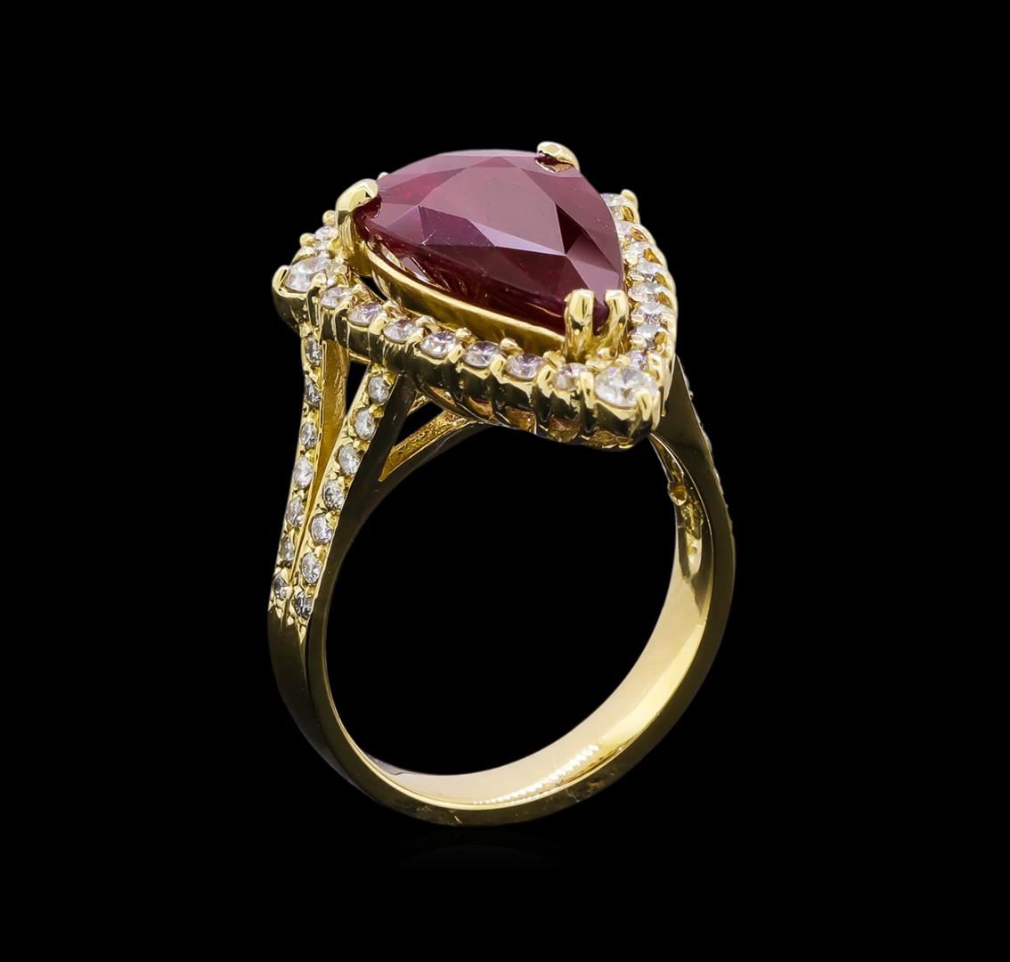 One electronically tested 14KT yellow gold lady's cast fashion ring with a split shank halo with a bright polish finish. Featured lady's ring has a shank measuring 3.25 millimeters in length. Identified with markings of "14K". Condition is new, good workmanship. Containing: One prong set pear brilliant cut natural ruby, measuring 15.78 x 9.63 x 5.27mm, (depth est.) approximate weight of 5.98ct., clarity is moderately included, medium dark, very slightly brownish, red color, (GIA R 6/3), cut is very good. Transmitting light with a minimum of distortion, transparent. Colored gemstones are presumed to have been subjected to commonly used enhancement processes. Graded in the setting. GIA Gem Trade Laboratory Report #5172501569.Four prong set round brilliant cut diamonds, measuring 2.70 - 2.60 x 1.59mm (depth est.) approximate total weight of 4 Stones = 0.25ct. Graded in the setting. Clarity: SI-1 to SI-2. Color: H - I. Cut Good Twenty prong set round brilliant cut diamonds, measuring 1.80 - 1.70 x 1.10mm (depth est.) approximate total weight of 20 Stones = 0.44ct. Graded in the setting. Clarity: SI-1 to SI-2. Color: G - Very Good Twenty-Eight bead set round brilliant cut diamonds, measuring 1.40 - 1.30 x 0.81mm (depth est.) approximate total weight of 28 Stones = 0.25ct. Graded in the setting. Clarity: SI-1 to SI-2. Color: G - Very Good. Total Weight of Colored Stones 5.98ct. Total Weight of Diamonds 0.94ct. Total Weight of Ring 7.70gm. GAS Appraised.
