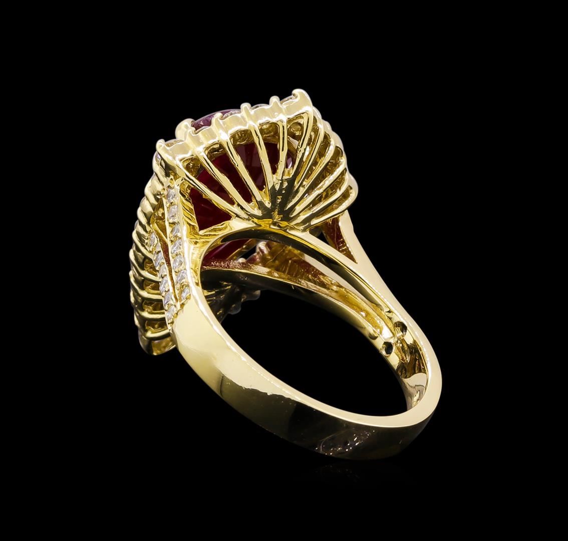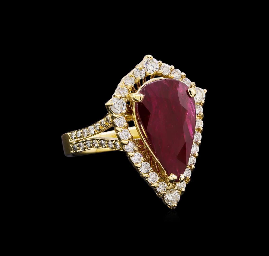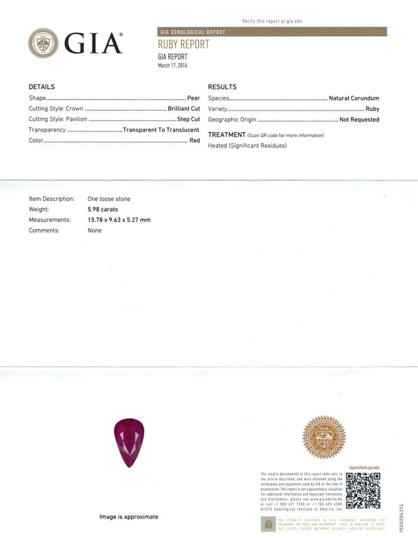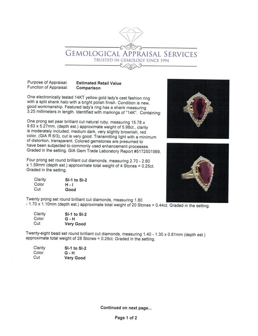One electronically tested 14KT yellow gold lady's cast fashion ring with a split shank halo with a bright polish finish. Featured lady's ring has a shank measuring 3.25 millimeters in length. Identified with markings of "14K". Condition is new, good workmanship. Containing: One prong set pear brilliant cut natural ruby, measuring 15.78 x 9.63 x 5.27mm, (depth est.) approximate weight of 5.98ct., clarity is moderately included, medium dark, very slightly brownish, red color, (GIA R 6/3), cut is very good. Transmitting light with a minimum of distortion, transparent. Colored gemstones are presumed to have been subjected to commonly used enhancement processes. Graded in the setting. GIA Gem Trade Laboratory Report #5172501569.Four prong set round brilliant cut diamonds, measuring 2.70 - 2.60 x 1.59mm (depth est.) approximate total weight of 4 Stones = 0.25ct. Graded in the setting. Clarity: SI-1 to SI-2. Color: H - I. Cut Good Twenty prong set round brilliant cut diamonds, measuring 1.80 - 1.70 x 1.10mm (depth est.) approximate total weight of 20 Stones = 0.44ct. Graded in the setting. Clarity: SI-1 to SI-2. Color: G - Very Good Twenty-Eight bead set round brilliant cut diamonds, measuring 1.40 - 1.30 x 0.81mm (depth est.) approximate total weight of 28 Stones = 0.25ct. Graded in the setting. Clarity: SI-1 to SI-2. Color: G - Very Good. Total Weight of Colored Stones 5.98ct. Total Weight of Diamonds 0.94ct. Total Weight of Ring 7.70gm. GAS Appraised.