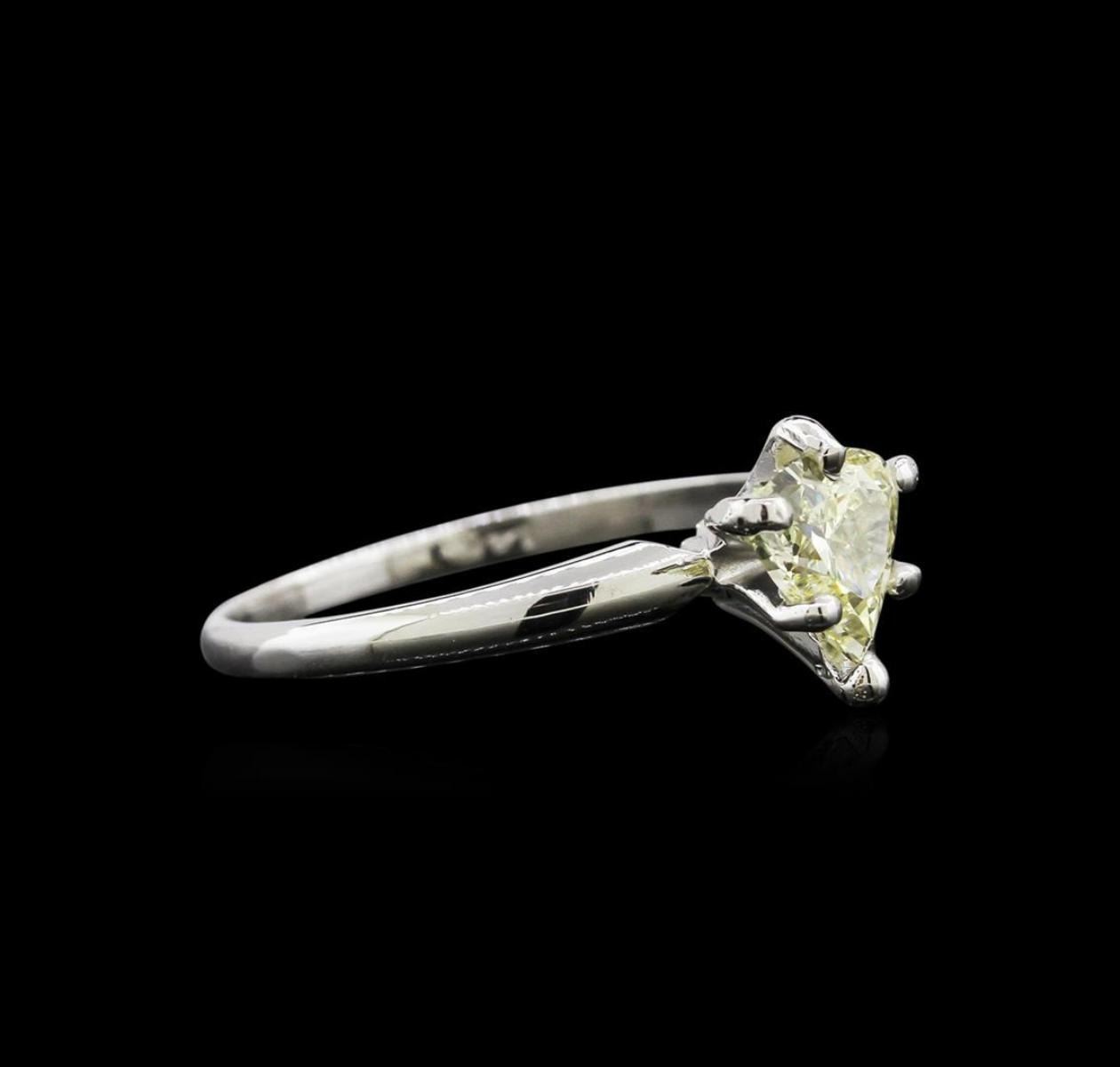 One electronically tested 14KT white gold lady's combination cast & assembled solitaire engagement ring with a bright polish finish. The featured lady's ring has a shank measuring 1.60 millimeters in width. Identified with markings of "14K". Condition is new, good workmanship. Containing: One pear shaped cut diamond, measuring 6.61 x 5.80 x 3.28mm (depth est.) approximate weight of 0.74ct. Graded loose prior to setting in the GIA Laboratory, Report #2141895629. Clarity: SI-2. Color: W - X. Total Weight of Diamonds 0.74ct. Total Weight of Ring 2.20gm. GAS Appraised.