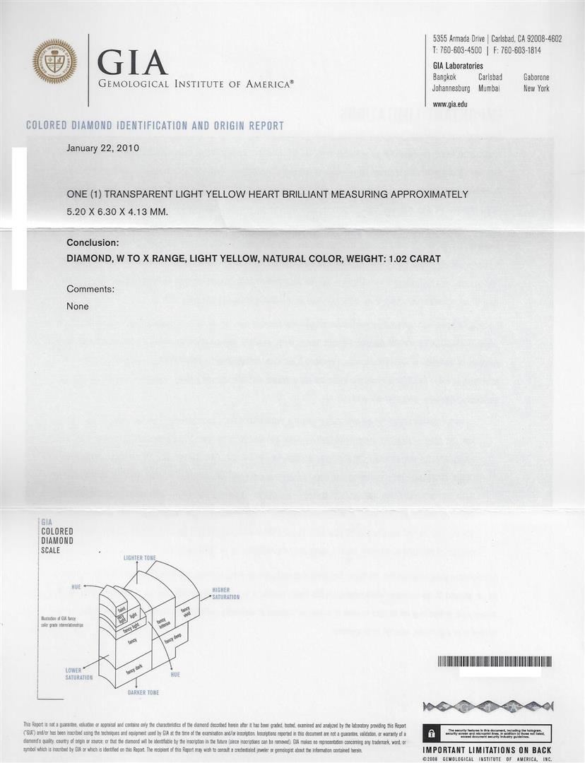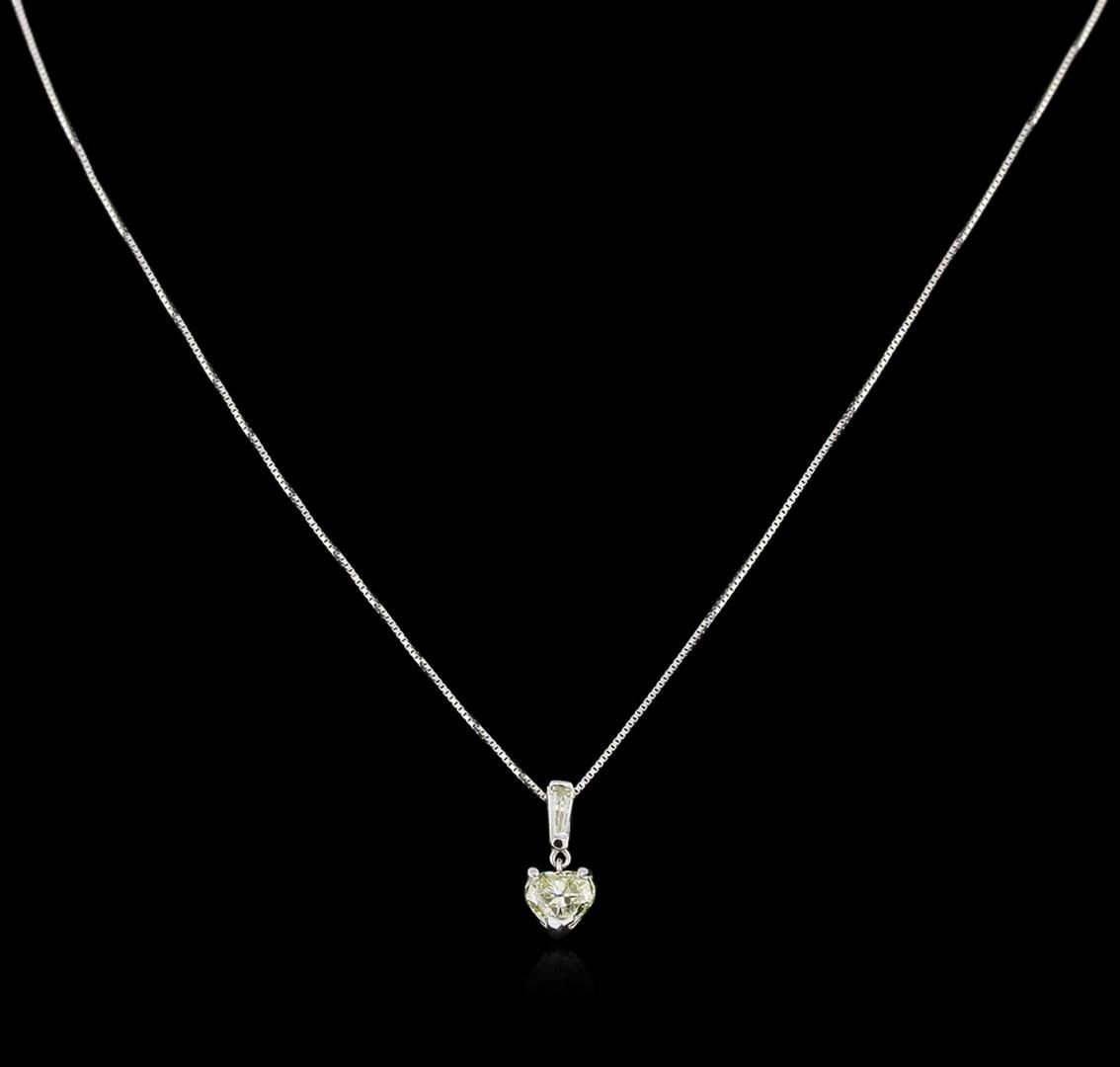 One electronically tested 14KT white gold lady's combination cast & assembled drop style pendant & chain 16.0" long, 0.70mm square box link with a spring ring clasp with a bright polish finish. Identified with markings of "14K". Condition is new, good workmanship. Containing: One prong set heart shaped cut diamond, measuring 5.20 x 6.30 x 4.13mm (depth est.) , 25.00.%. GTCF approximate weight of 1.02ct. Graded loose prior to setting in the GIA Laboratory, Report #2111617078. Clarity: I-1. Color: W - X. Cut Good One channel set baguette cut (tapered) diamond, measuring 4.90 x 2.00 x 1.70mm (depth est.) approximate weight of 0.15ct. Graded in the setting. Clarity: SI-1. Color: Good. Total Weight of Diamonds 1.17ct. Total Weight of Pendant & Chain 1.90gm. GAS Appraised at $7,920.00.