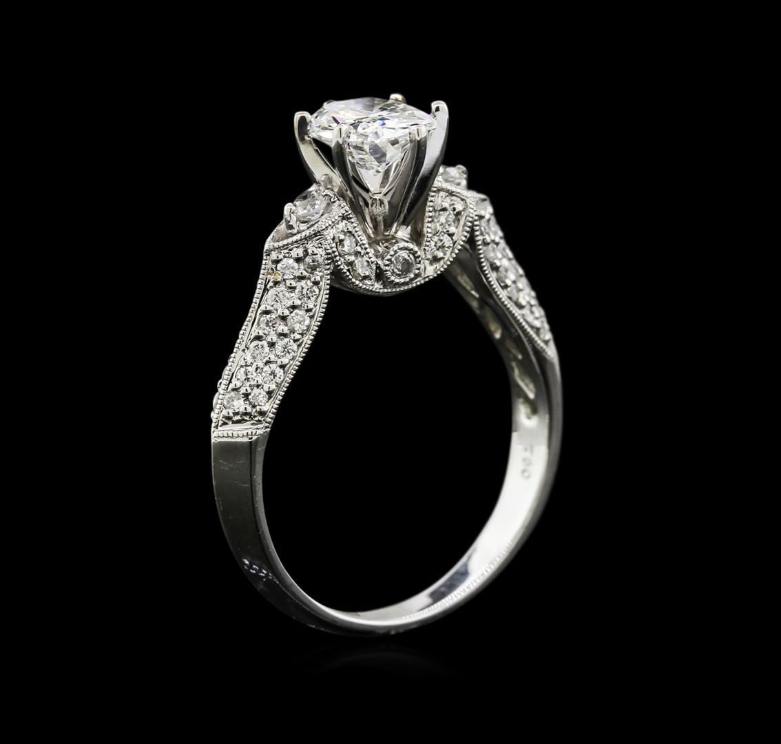 One electronically tested 18KT white gold lady's combination cast & assembled wedding ring with a knife edge shank with a bright polish with milgrain detailing finish. The featured lady's ring has a shank measuring 2.35 millimeters wide. Identified with markings of "18K 750". Condition is new, good workmanship. Containing: One prong set oval shaped cut diamond, measuring 7.81 x 5.90 x 3.44mm (depth est.) , 5.00.%. GTCF approximate weight of 1.06ct. Graded loose prior to setting in the GIA Laboratory, Report #6167016820. Clarity: VS-1. Color: F. Cut Very Good Two prong set round brilliant cut diamonds, measuring 2.20 - 2.15 x 1.42mm (depth est.) approximate total weight of 2 Stones = 0.08ct. Graded in the setting. Clarity: SI-1. Color: G - H. Cut Very Good Two prong set round brilliant cut diamonds, measuring 1.50 - 1.45 x 0.96mm (depth est.) approximate total weight of 2 Stones = 0.03ct. Graded in the setting. Clarity: SI-1. Color: Good Fifty-Six bead set round brilliant cut diamonds, measuring 1.40 - 1.10 x 0.75mm (depth est.) approximate total weight of 56 Stones = 0.34ct. Graded in the setting. Clarity: SI-1 to I-1. Color: H - I. Cut Good. Total Weight of Diamonds 1.51ct. Total Weight of Ring 5.10gm. GAS Appraised.