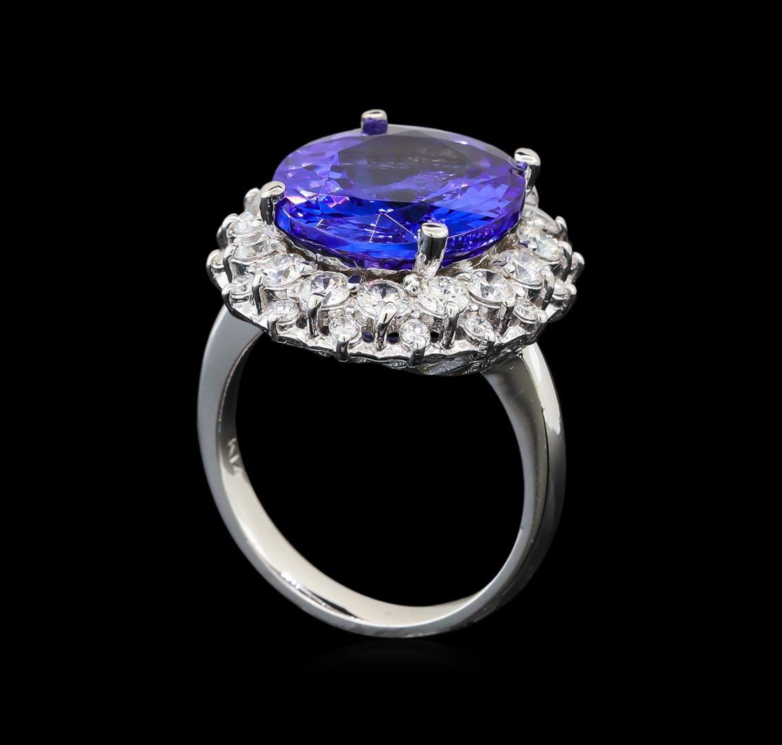 One electronically tested 14KT white gold lady's cast fashion ring with a double basket halo with a bright polish finish. The featured lady's ring has a shank measuring 2.95 millimeters wide. Identified with markings of 'K14'. Condition is new, good workmanship. Containing: One prong set oval modified brilliant cut natural tanzanite, measuring 15.26 x 12.69 x 7.56mm, (depth est.) approximate weight of 10.03ct., clarity is eye clean, medium dark, very slightly grayish, bluish violet color, (GIA bV 6/3), cut is very good. Transmitting light with no distortion, transparent. Colored gemstones are presumed to have been subjected to commonly used enhancement processes. Graded loose prior to setting in the GIA Laboratory, Report #2171665601. Sixteen prong set round brilliant cut diamonds, measuring 2.80 - 2.70 x 1.65mm (depth est.) approximate total weight of 16 Stones = 1.22ct. Graded in the setting. Clarity SI-1 to SI-2. Color: H - J Cut Good Sixteen prong set round brilliant cut diamonds, measuring 1.60 - 1.50 x 0.93mm (depth est.) approximate total weight of 16 Stones = 0.21ct. Graded in the setting. Clarity SI-1 to SI-2. Color: H - I Cut Good. Total Weight of Colored Stones 10.03ct.. Total Weight of Diamonds 1.43ct.. Total Weight of Ring 8.70gm. GAS Appraised at $21,560.00.