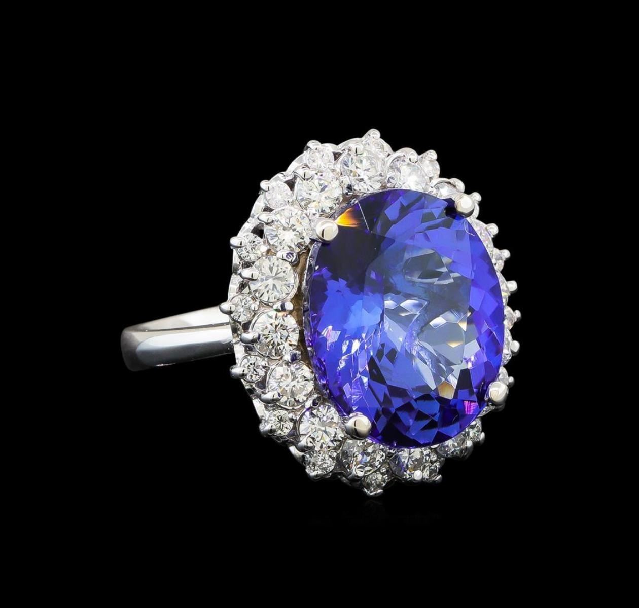 One electronically tested 14KT white gold lady's cast fashion ring with a double basket halo with a bright polish finish. The featured lady's ring has a shank measuring 2.95 millimeters wide. Identified with markings of 'K14'. Condition is new, good workmanship. Containing: One prong set oval modified brilliant cut natural tanzanite, measuring 15.26 x 12.69 x 7.56mm, (depth est.) approximate weight of 10.03ct., clarity is eye clean, medium dark, very slightly grayish, bluish violet color, (GIA bV 6/3), cut is very good. Transmitting light with no distortion, transparent. Colored gemstones are presumed to have been subjected to commonly used enhancement processes. Graded loose prior to setting in the GIA Laboratory, Report #2171665601. Sixteen prong set round brilliant cut diamonds, measuring 2.80 - 2.70 x 1.65mm (depth est.) approximate total weight of 16 Stones = 1.22ct. Graded in the setting. Clarity SI-1 to SI-2. Color: H - J Cut Good Sixteen prong set round brilliant cut diamonds, measuring 1.60 - 1.50 x 0.93mm (depth est.) approximate total weight of 16 Stones = 0.21ct. Graded in the setting. Clarity SI-1 to SI-2. Color: H - I Cut Good. Total Weight of Colored Stones 10.03ct.. Total Weight of Diamonds 1.43ct.. Total Weight of Ring 8.70gm. GAS Appraised.
